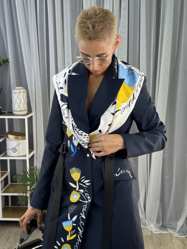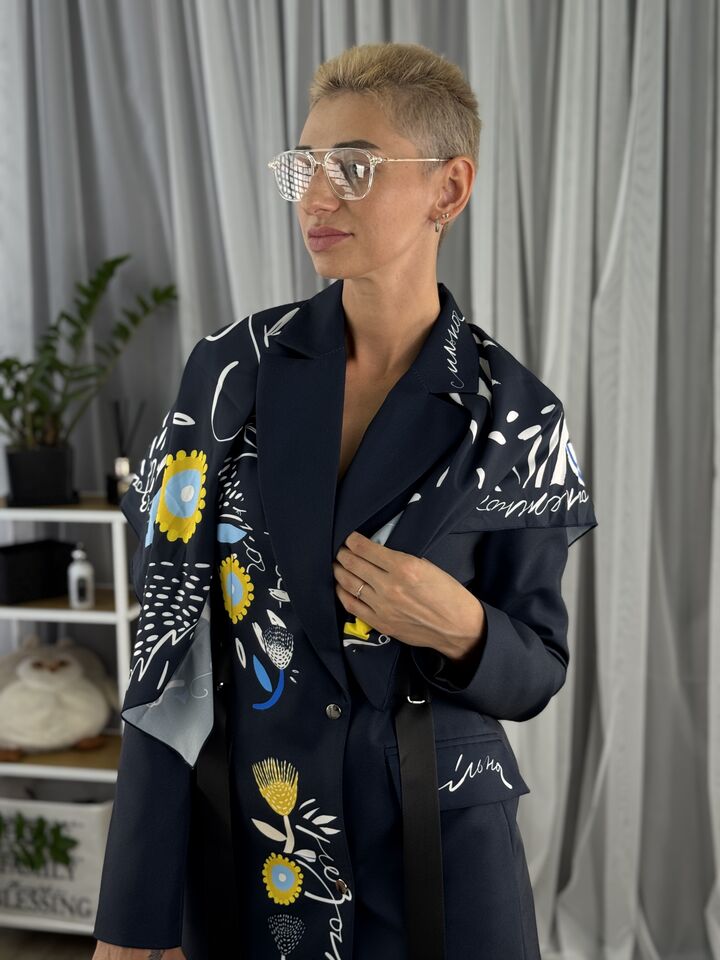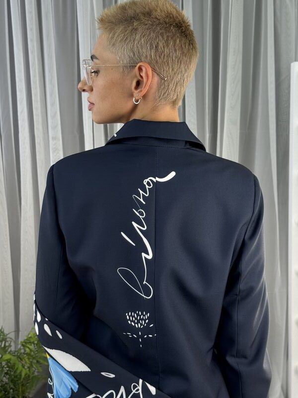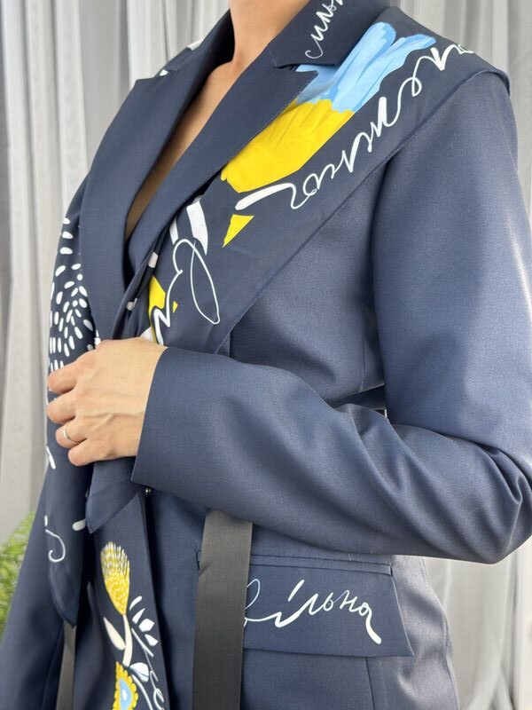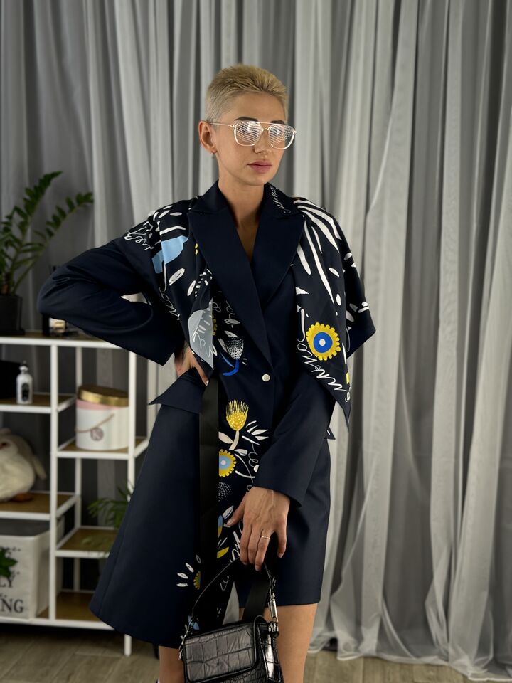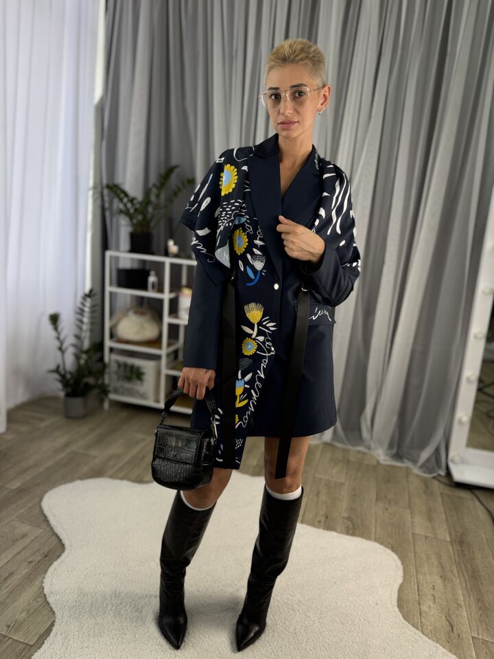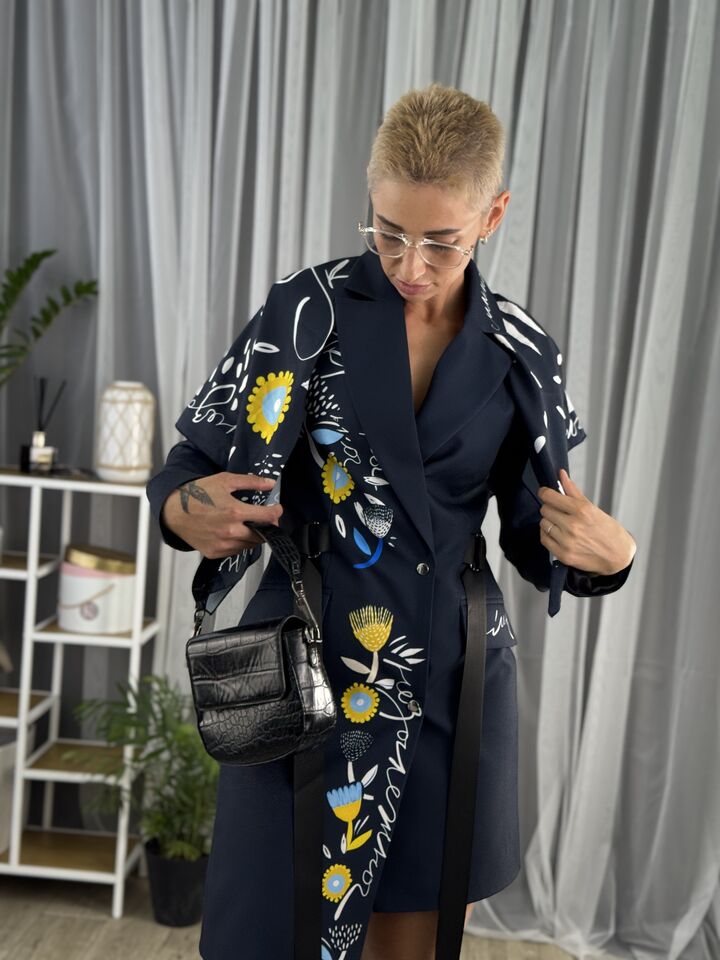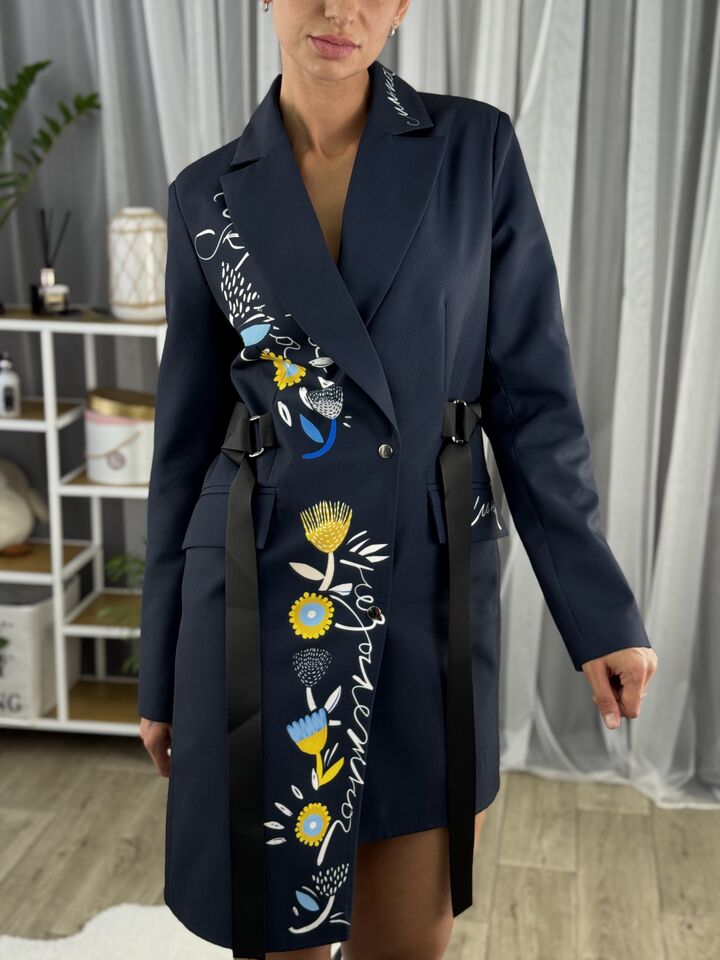 Сукня-жакет, приталена синя із українським принтом