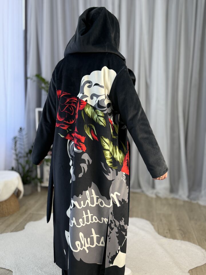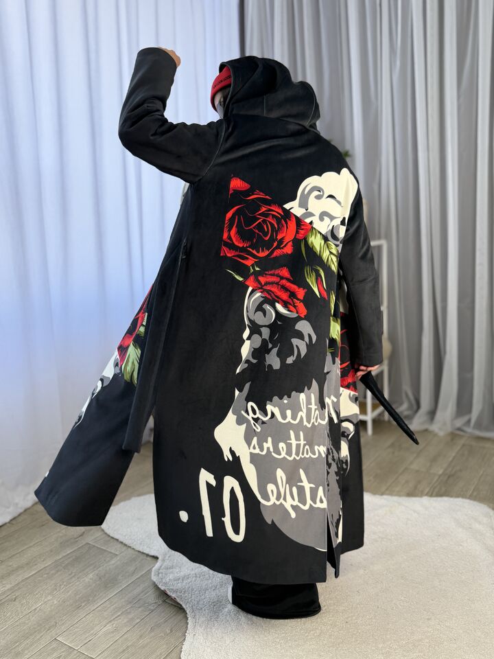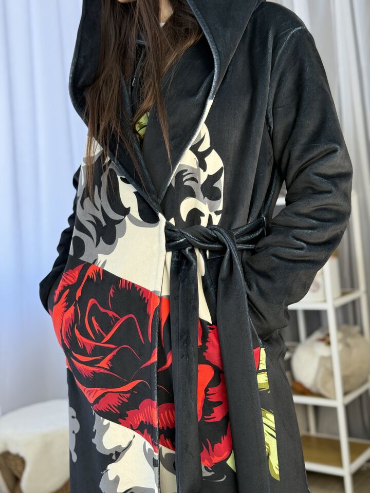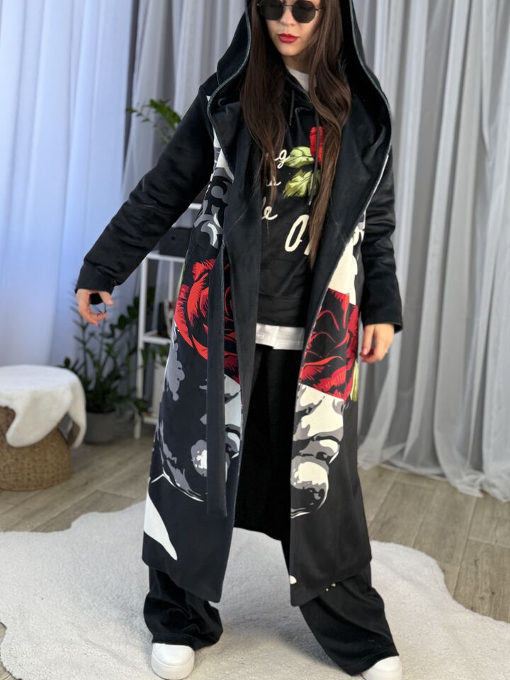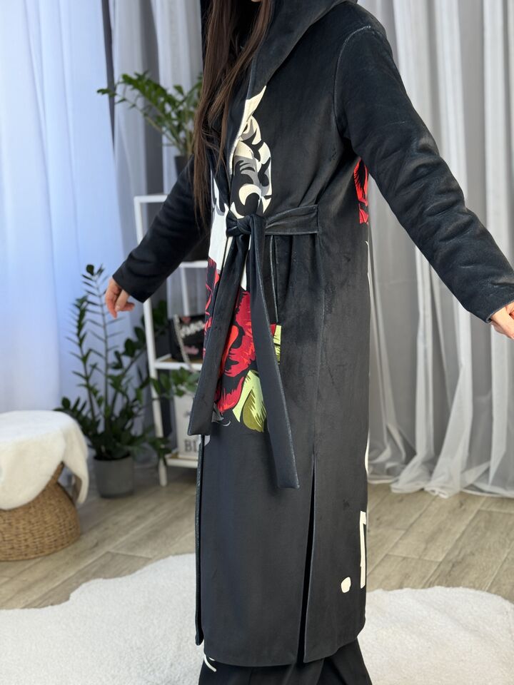Пальто прямого крою, з капюшоном (вшитий), зав’язується на пасок, є функціональні кишені, довжина виробу: 125 см, довжина рукава: 65 см (по зовнішньому шву), 47 см (по внутрішньому)