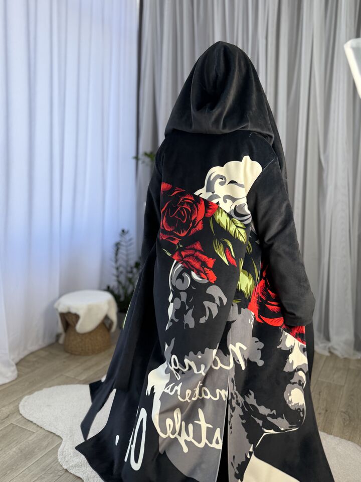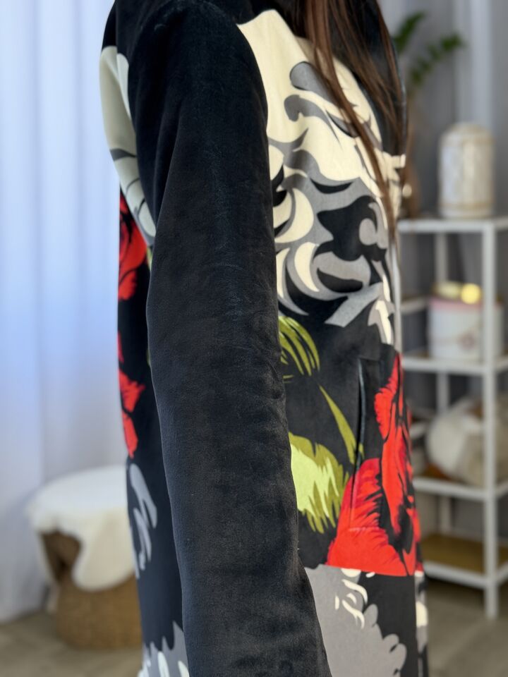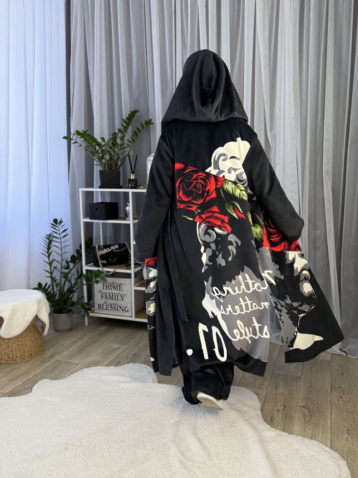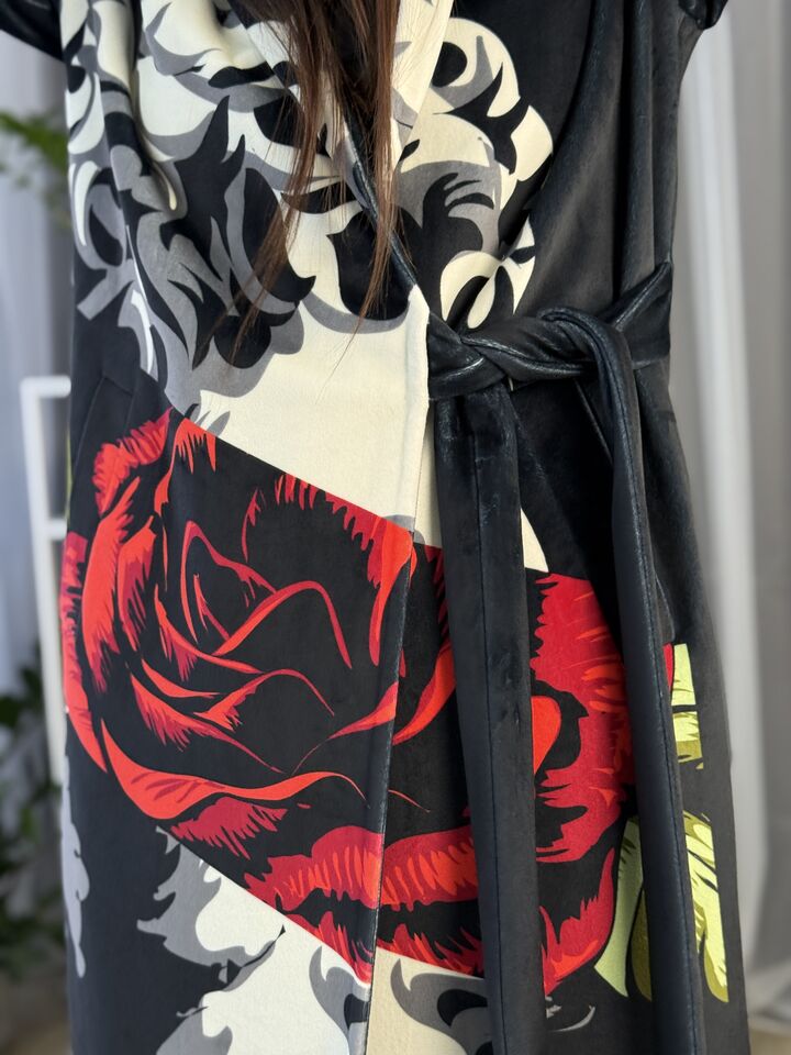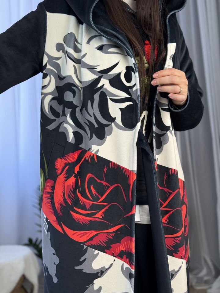 Пальто прямого крою, з капюшоном (вшитий), зав’язується на пасок, є функціональні кишені, довжина виробу: 125 см, довжина рукава: 65 см (по зовнішньому шву), 47 см (по внутрішньому)
