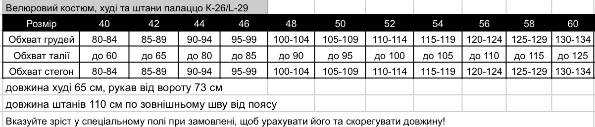 Худі вільного крою із капюшоном, без кишень, спущене плече, довжина по спинці – 65 см, довжина рукава від горловини — 73 см. Штани прямого крою, довжина по зовнішньому шву від поясу 110 см. Шнурок на капюшоні.