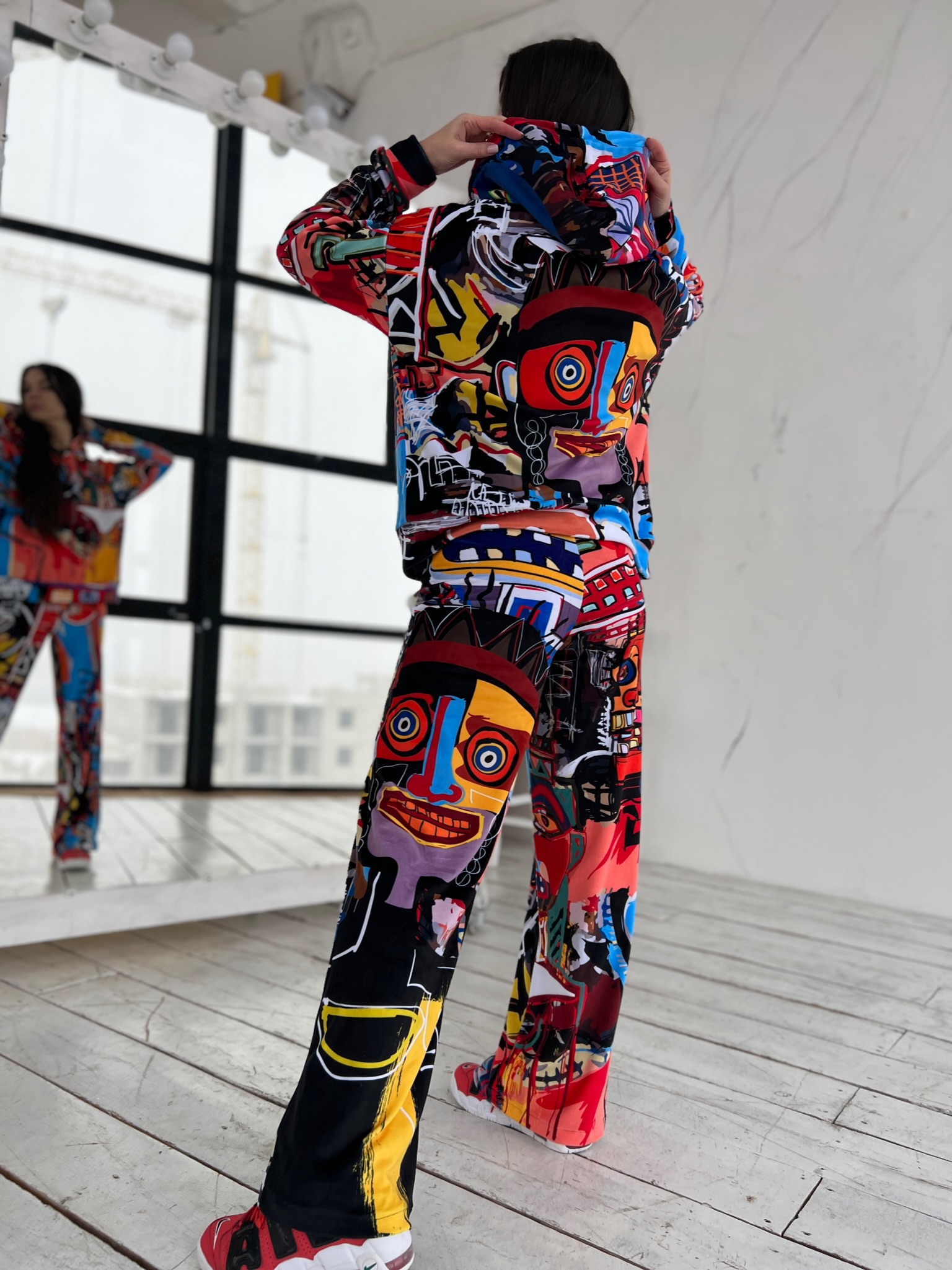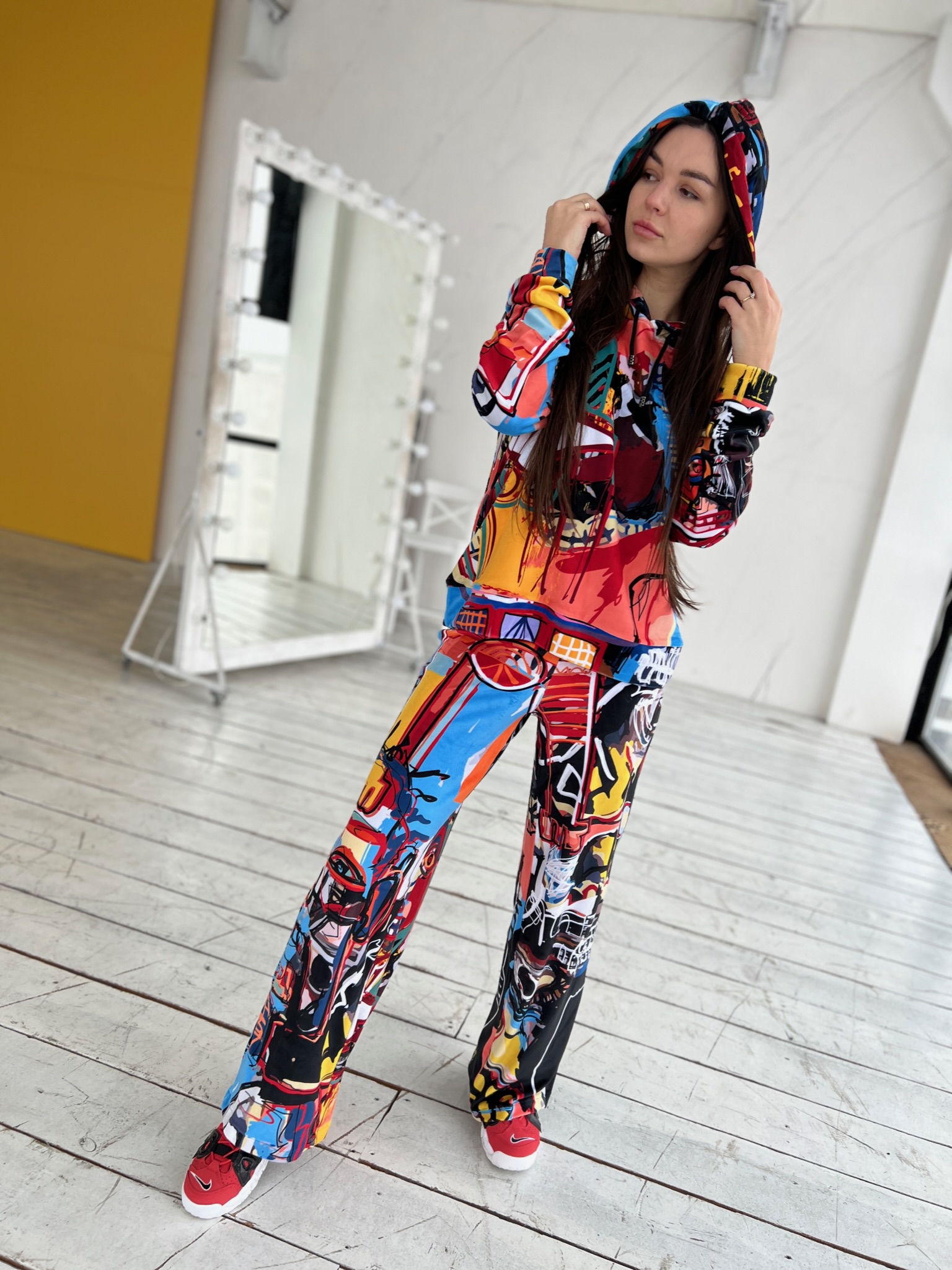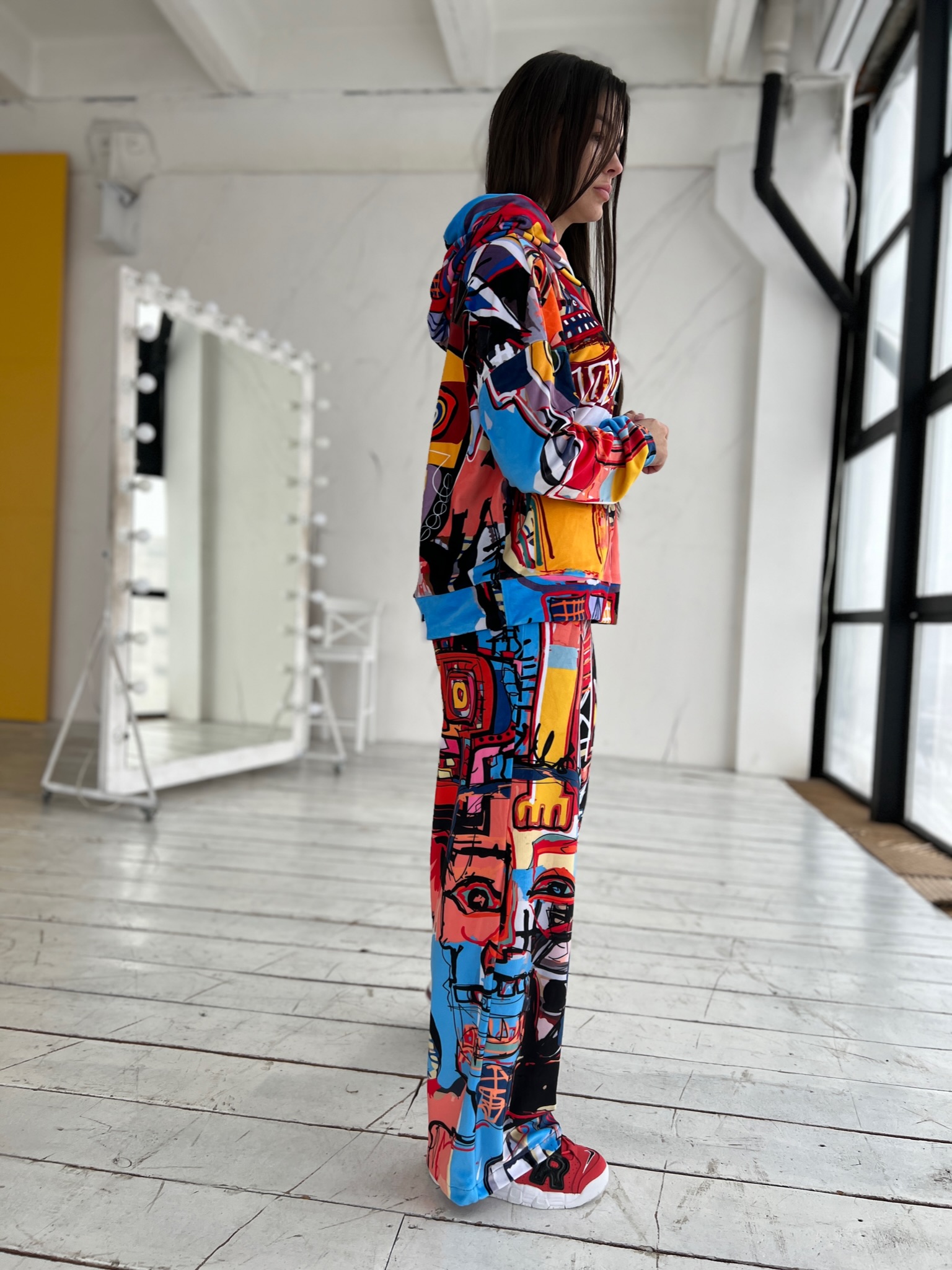 Худі вільного крою із капюшоном, без кишень, спущене плече, довжина по спинці – 65 см, довжина рукава від горловини — 73 см. Штани прямого крою, довжина по зовнішньому шву від поясу 110 см. Шнурок на капюшоні.