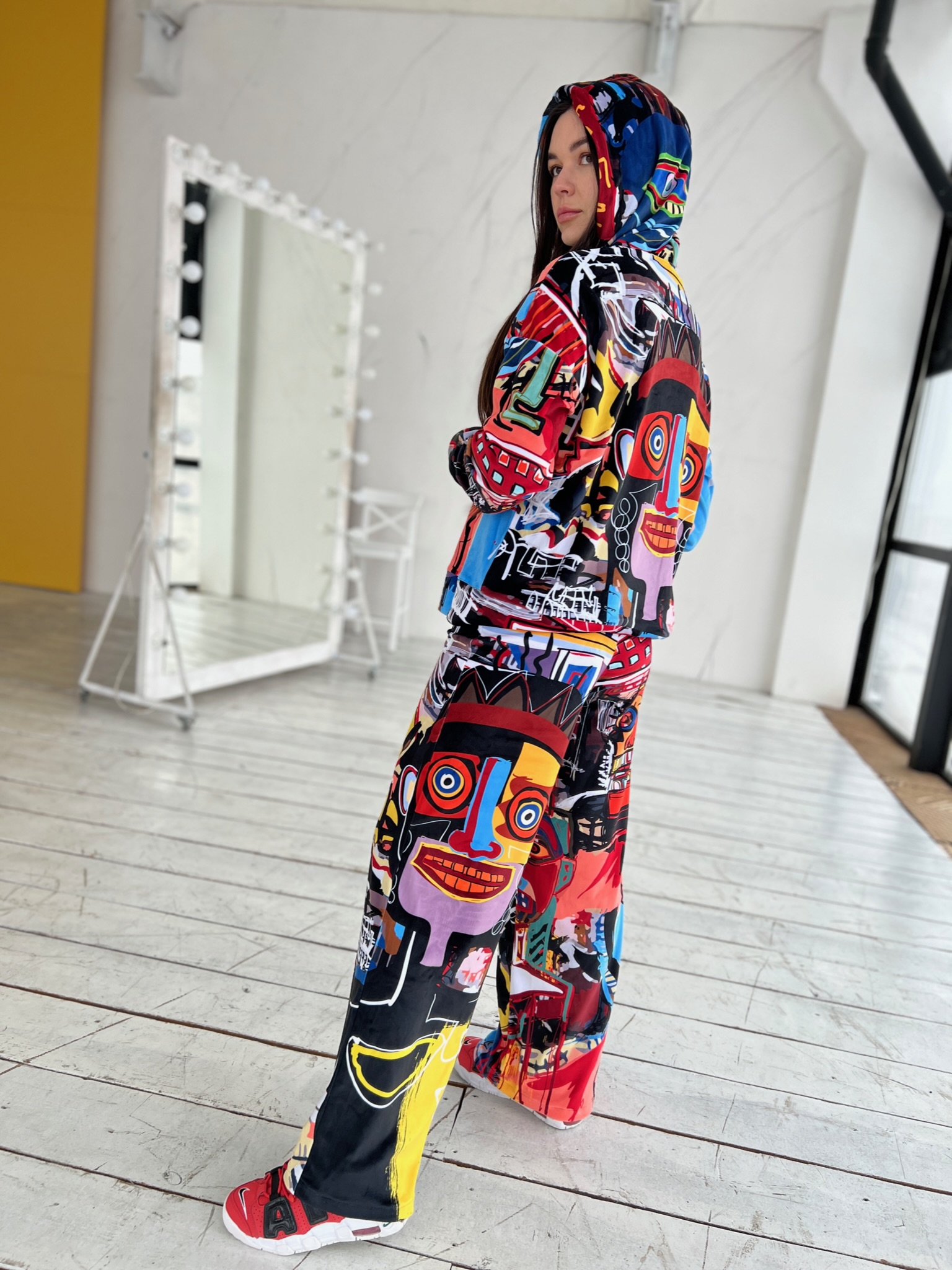 • Комплект: худі + прямі штани • Сезон: весна/осінь • Матеріал: велюр • Капюшон на худі: є • Пояс: резинка • Посадка: oversize • Догляд: прання 30°