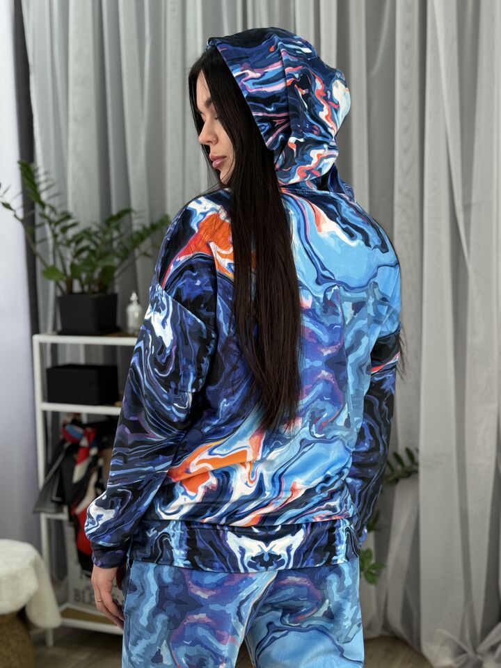 Худі вільного крою із капюшоном, без кишень, спущене плече, довжина по спинці – 65 см, довжина рукава від горловини — 73 см. Штани джогери, з еластичними резинками знизу, є кишені, довжина по зовнішньому шву від поясу 105 см. Шнурок на капюшоні.