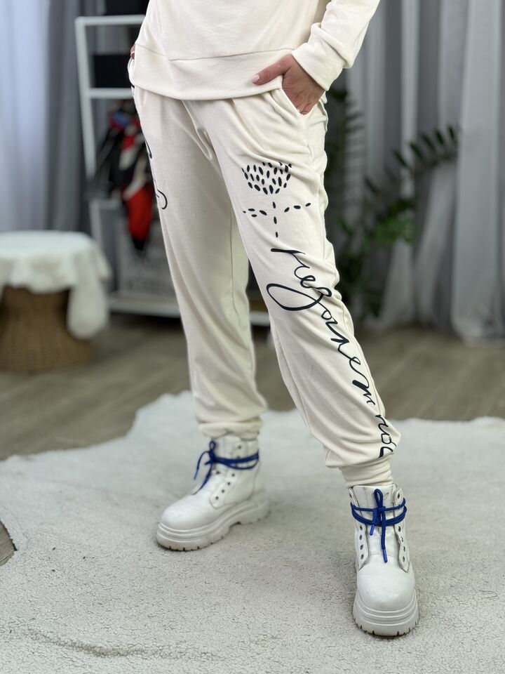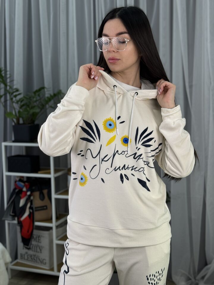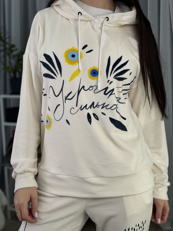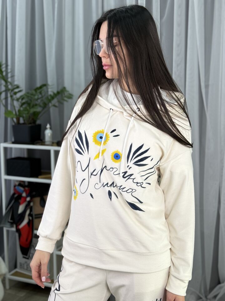 Худі вільного крою із капюшоном, без кишень, спущене плече, довжина по спинці – 65 см, довжина рукава від горловини — 73 см. Штани джогери, з еластичними резинками знизу, є кишені, довжина по зовнішньому шву від поясу 105 см. Шнурок на капюшоні.