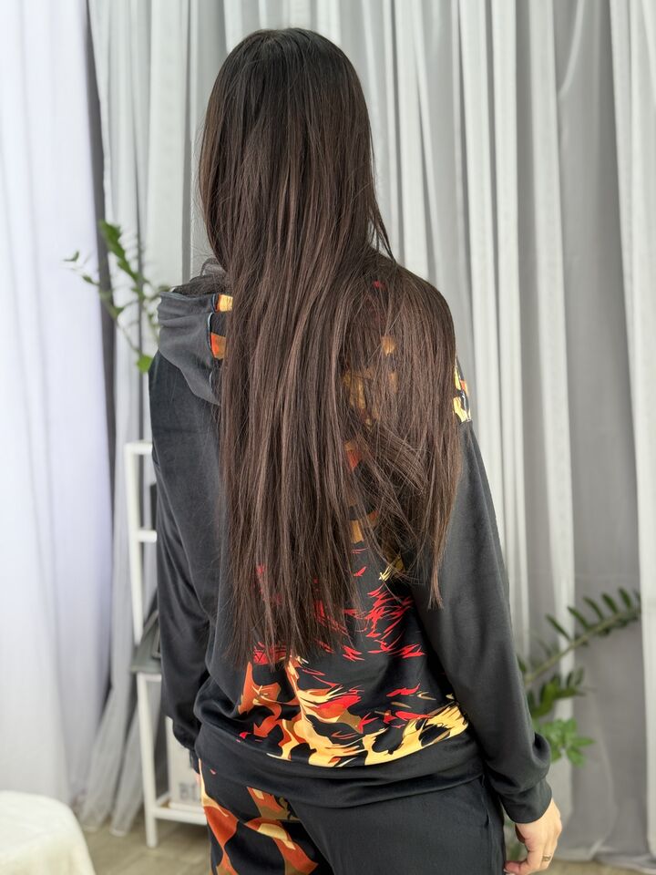 Худі вільного крою із капюшоном, без кишень, спущене плече, довжина по спинці – 65 см, довжина рукава від горловини — 73 см. Штани джогери, з еластичними резинками знизу, є кишені, довжина по зовнішньому шву від поясу 105 см. Шнурок на капюшоні.