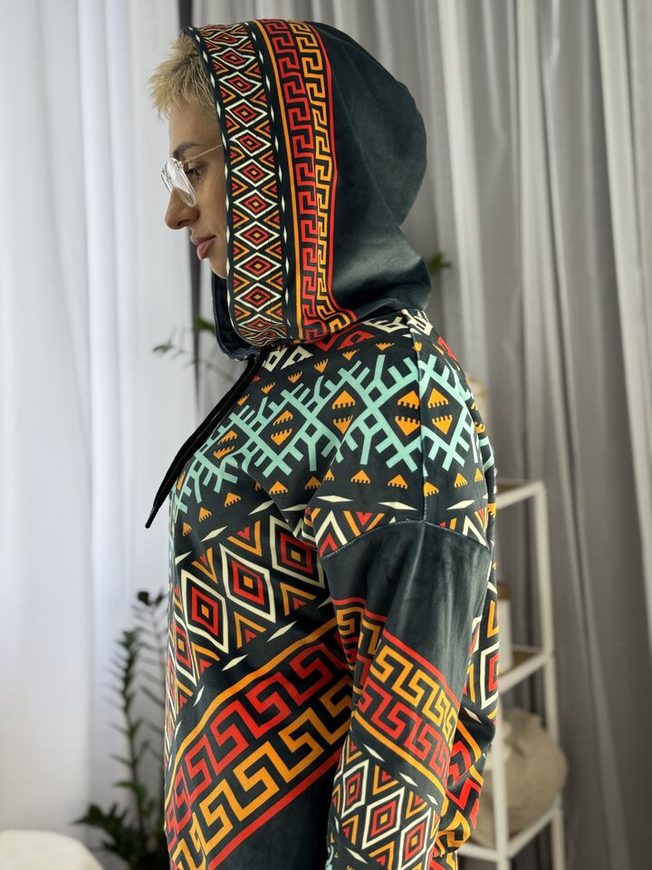 Худі вільного крою із капюшоном, без кишень, спущене плече, довжина по спинці – 65 см, довжина рукава від горловини — 73 см. Штани прямого крою, довжина по зовнішньому шву від поясу 110 см. Шнурок на капюшоні.