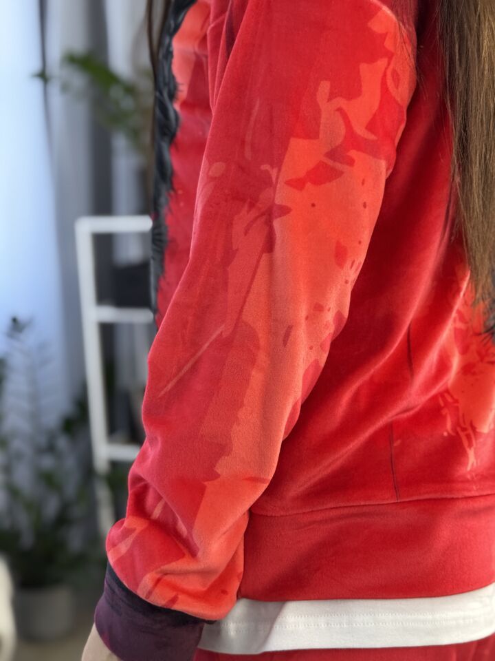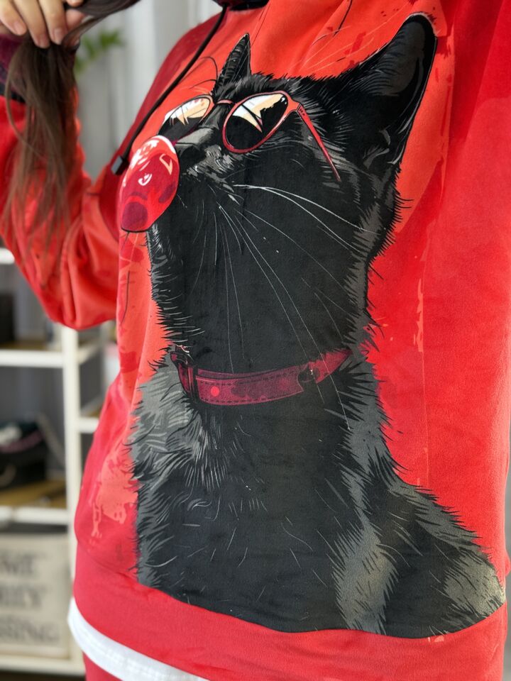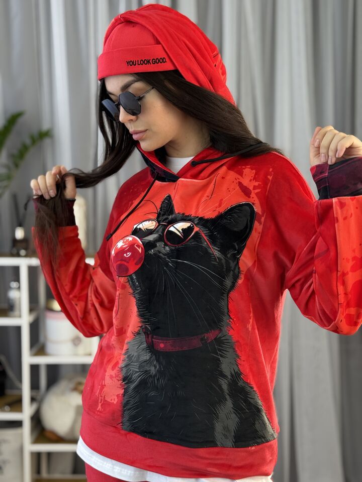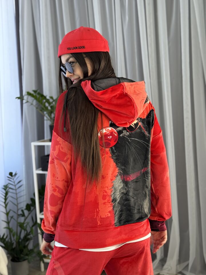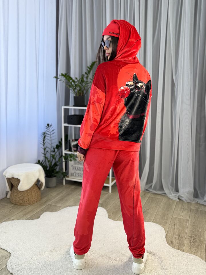 Велюровий жіночий костюм, сезон весна/осінь, червоний, принт із котом