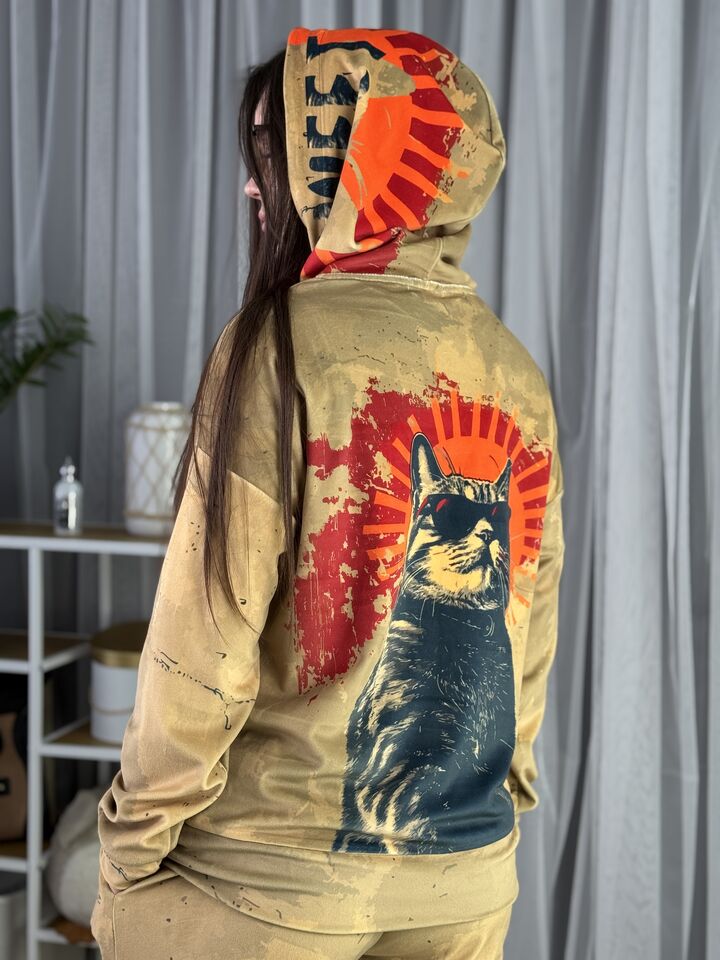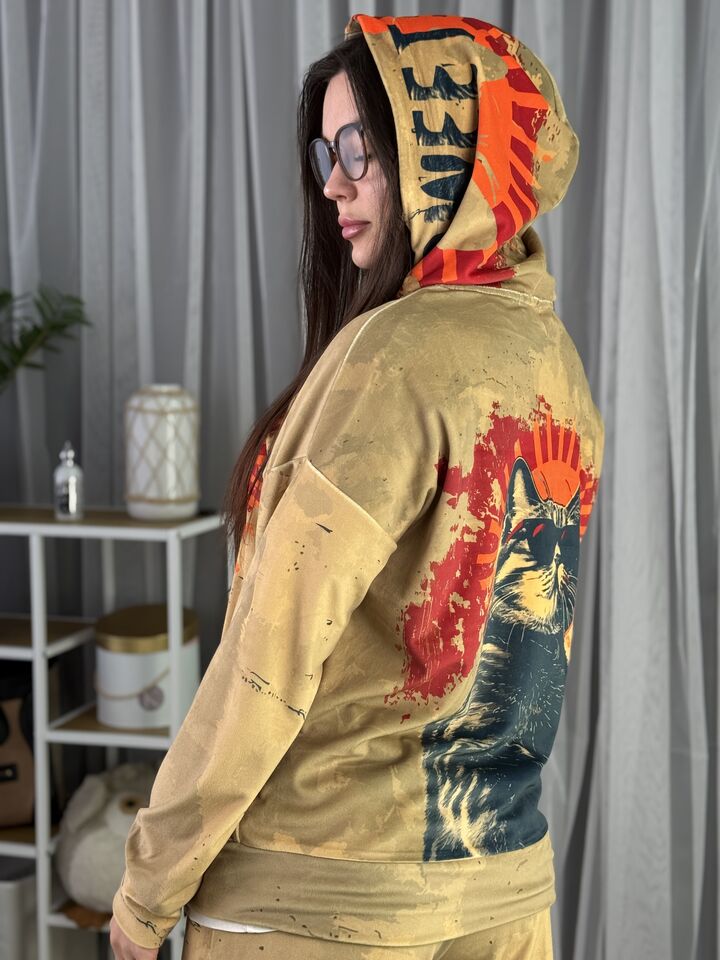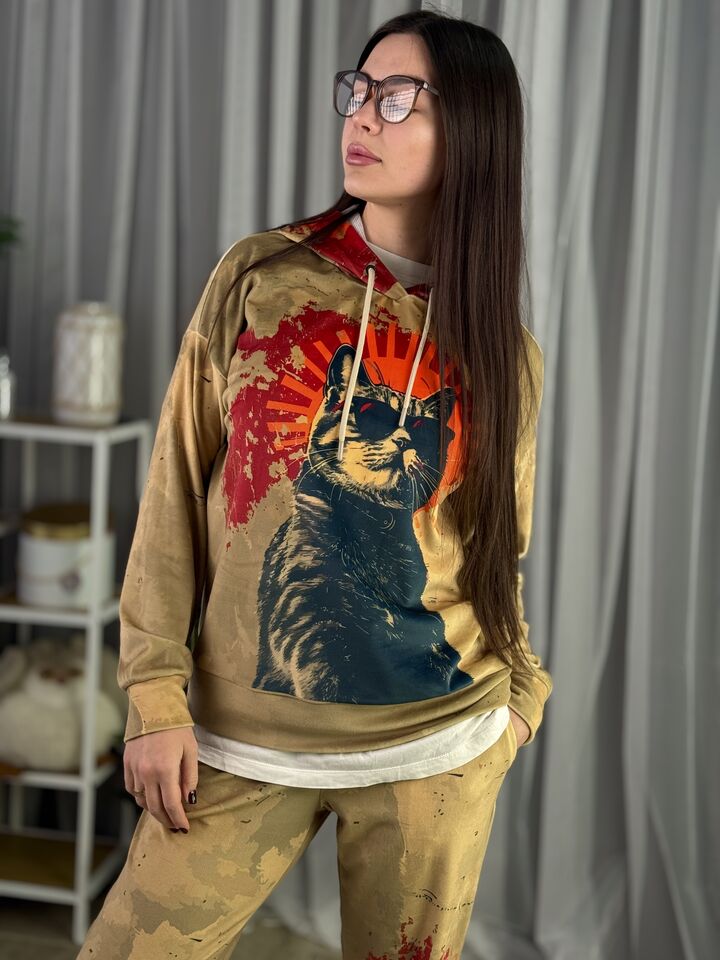 Худі вільного крою із капюшоном, без кишень, спущене плече, довжина по спинці – 65 см, довжина рукава від горловини — 73 см. Штани джогери, з еластичними резинками знизу, є кишені, довжина по зовнішньому шву від поясу 105 см. Шнурок на капюшоні.