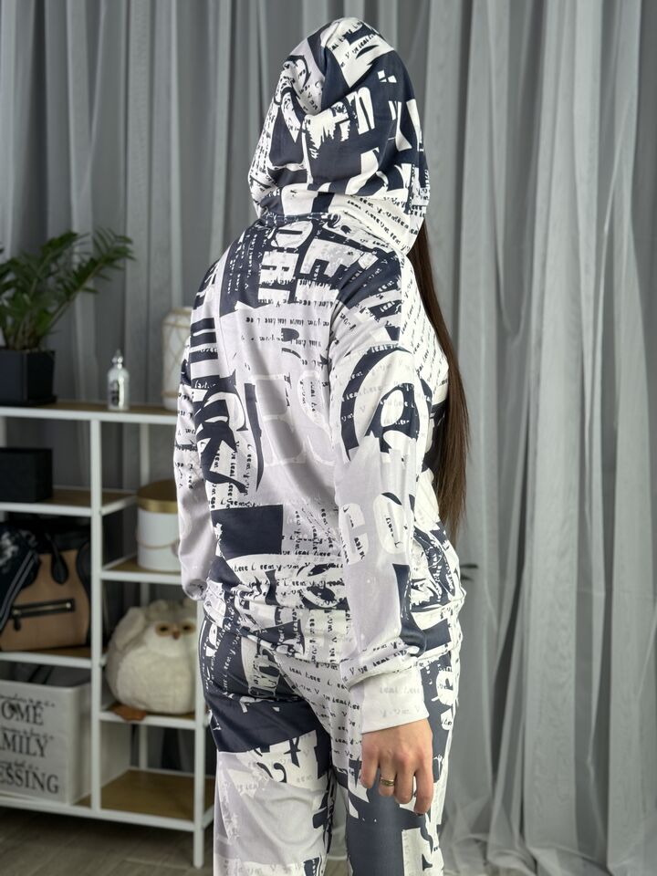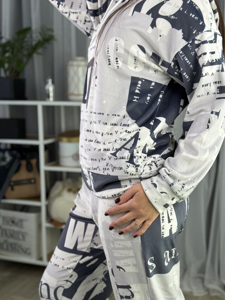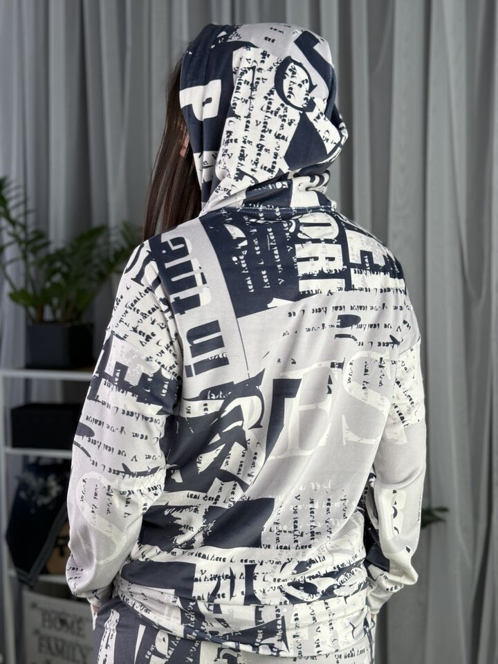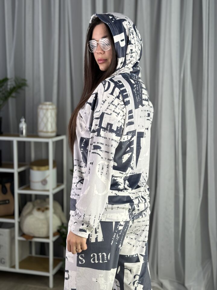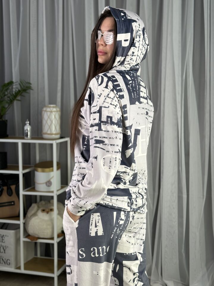 Худі вільного крою із капюшоном, без кишень, спущене плече, довжина по спинці – 65 см, довжина рукава від горловини — 73 см. Штани джогери, з еластичними резинками знизу, є кишені, довжина по зовнішньому шву від поясу 105 см. Шнурок на капюшоні.