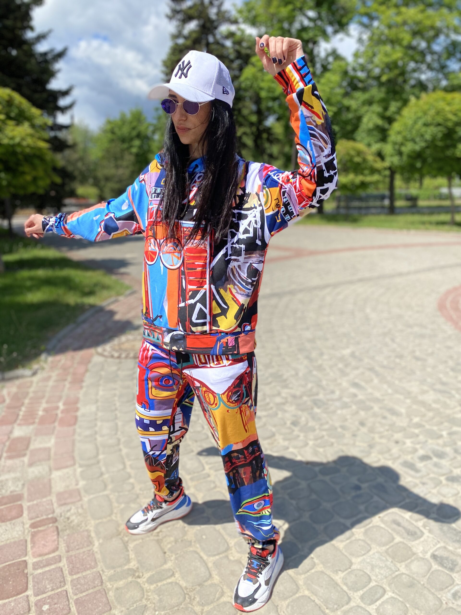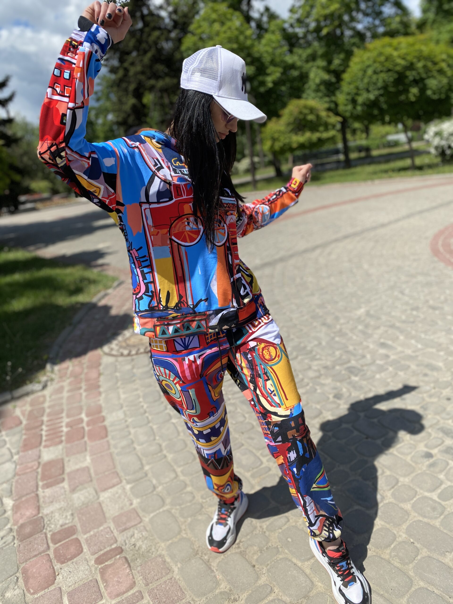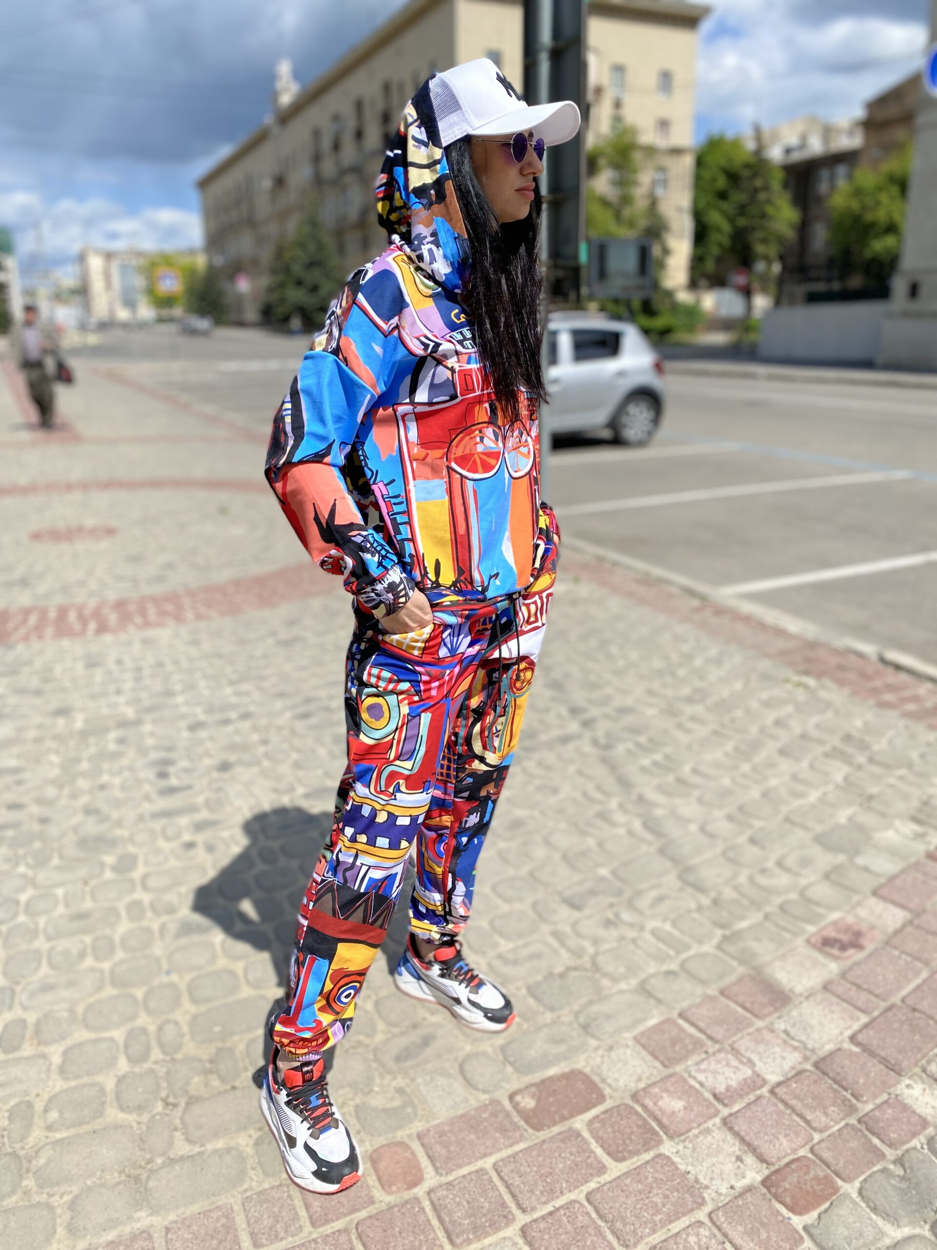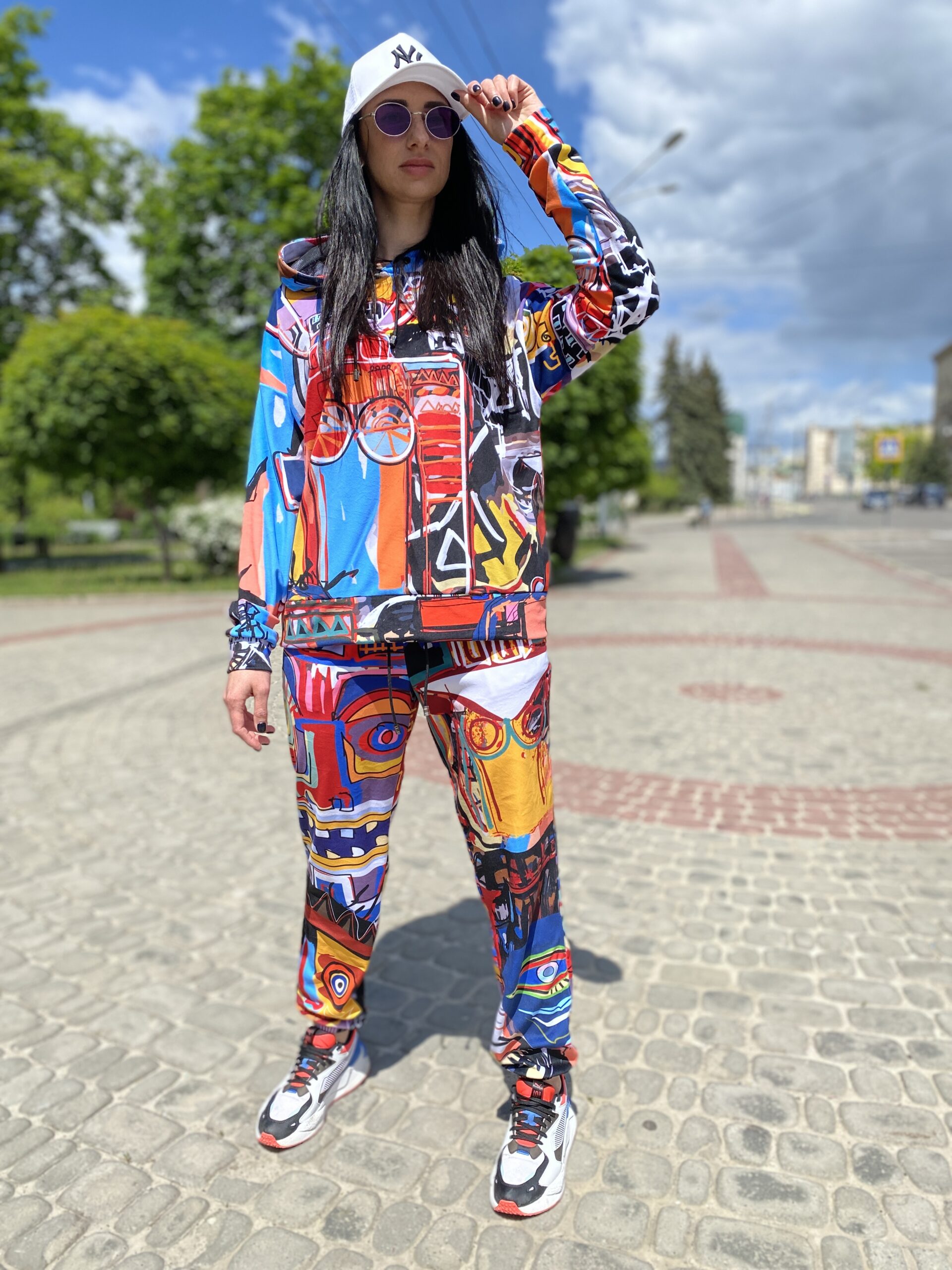 Худі вільного крою із капюшоном, без кишень, спущене плече, довжина по спинці – 65 см, довжина рукава від горловини — 73 см. Штани джогери, з еластичними резинками знизу, є кишені, довжина по зовнішньому шву від поясу 105 см. Шнурок на капюшоні.