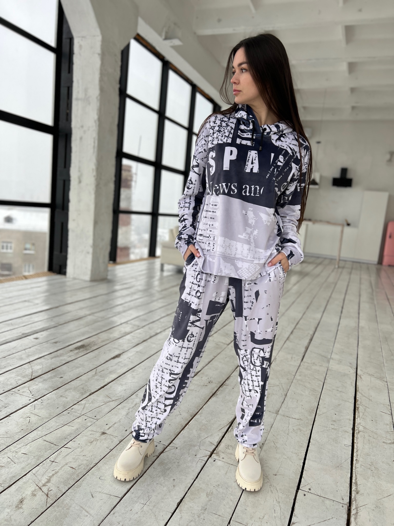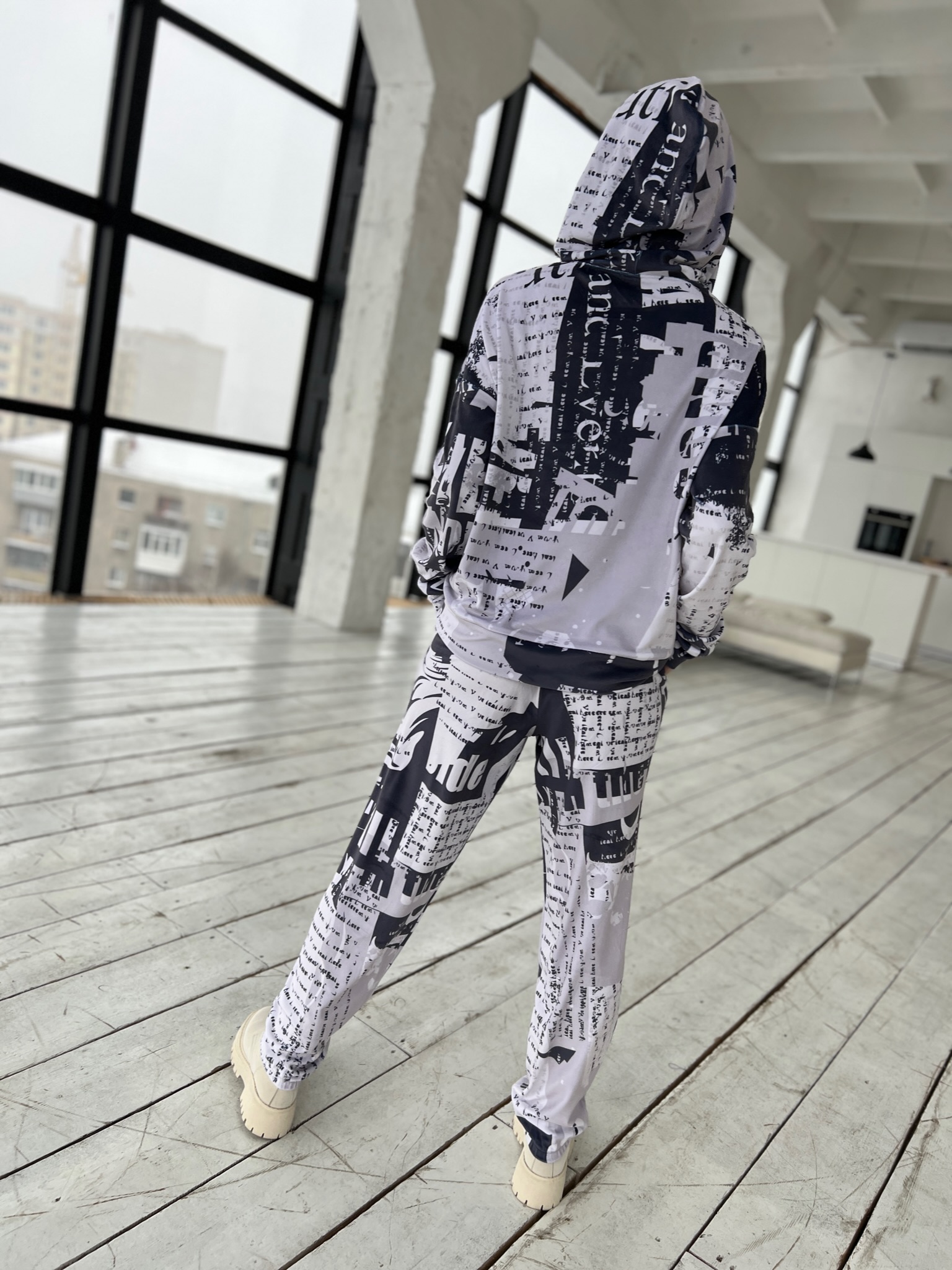 Худі вільного крою із капюшоном, без кишень, спущене плече, довжина по спинці – 65 см, довжина рукава від горловини — 73 см. Штани джогери, з еластичними резинками знизу, є кишені, довжина по зовнішньому шву від поясу 105 см. Шнурок на капюшоні.