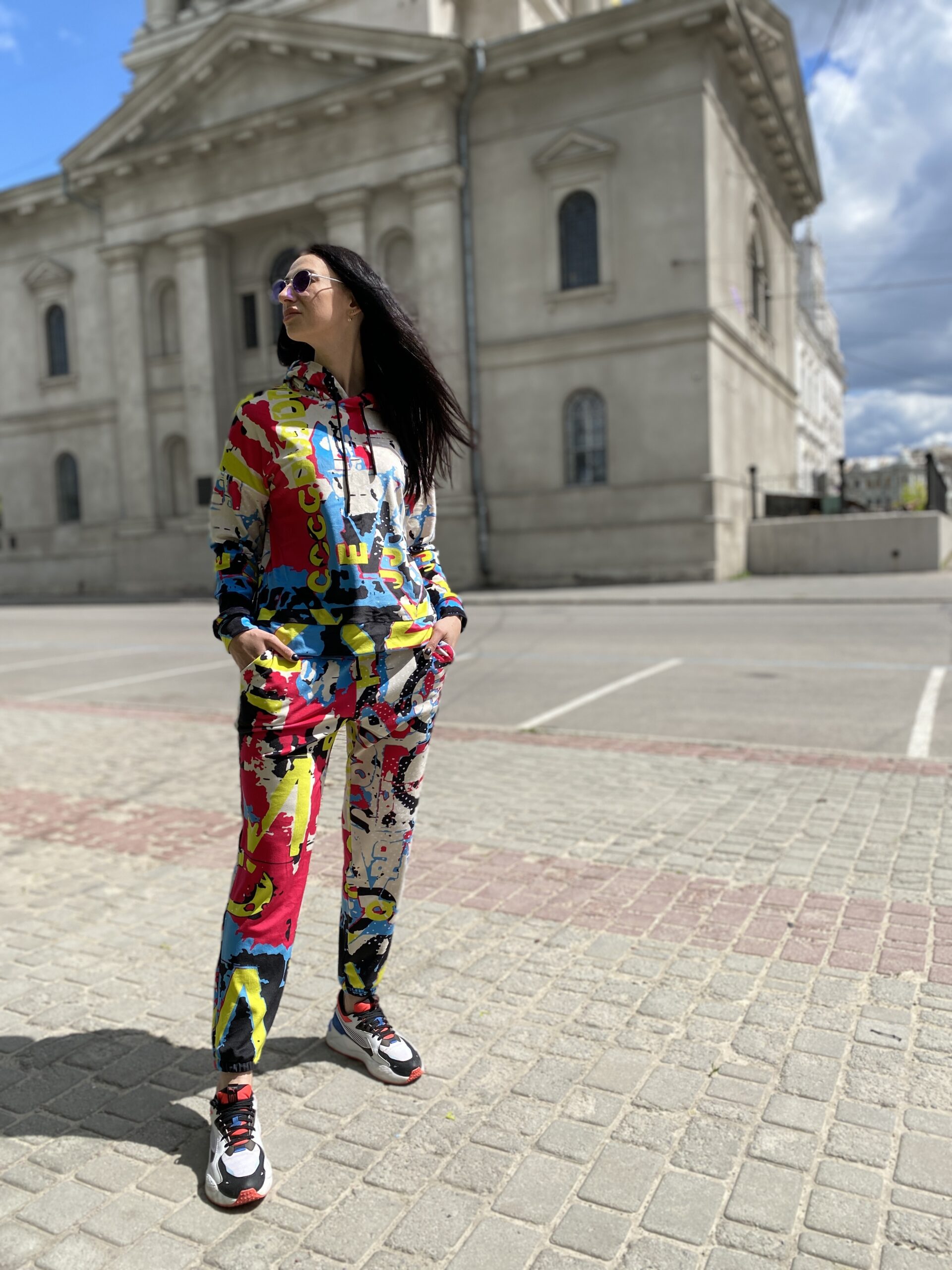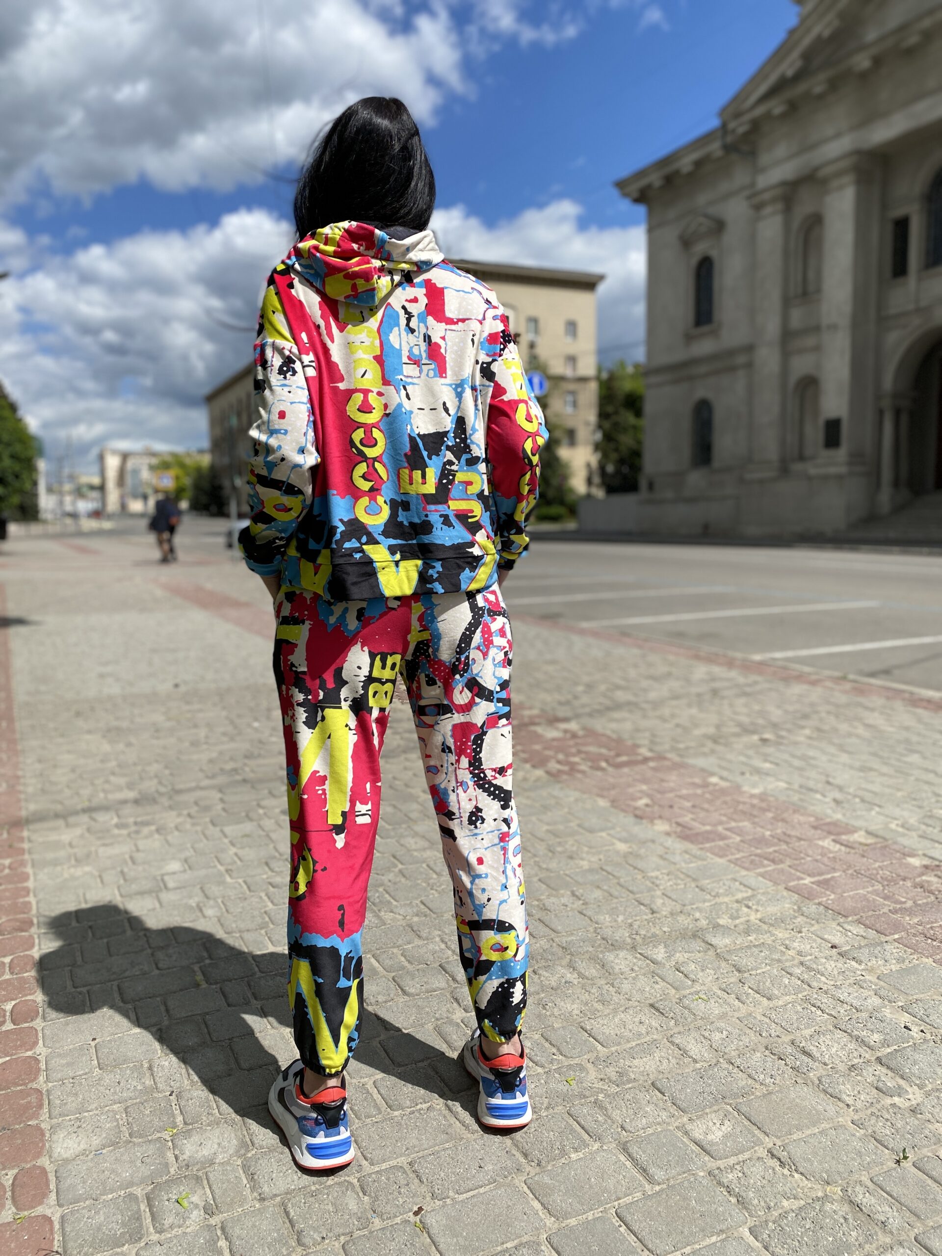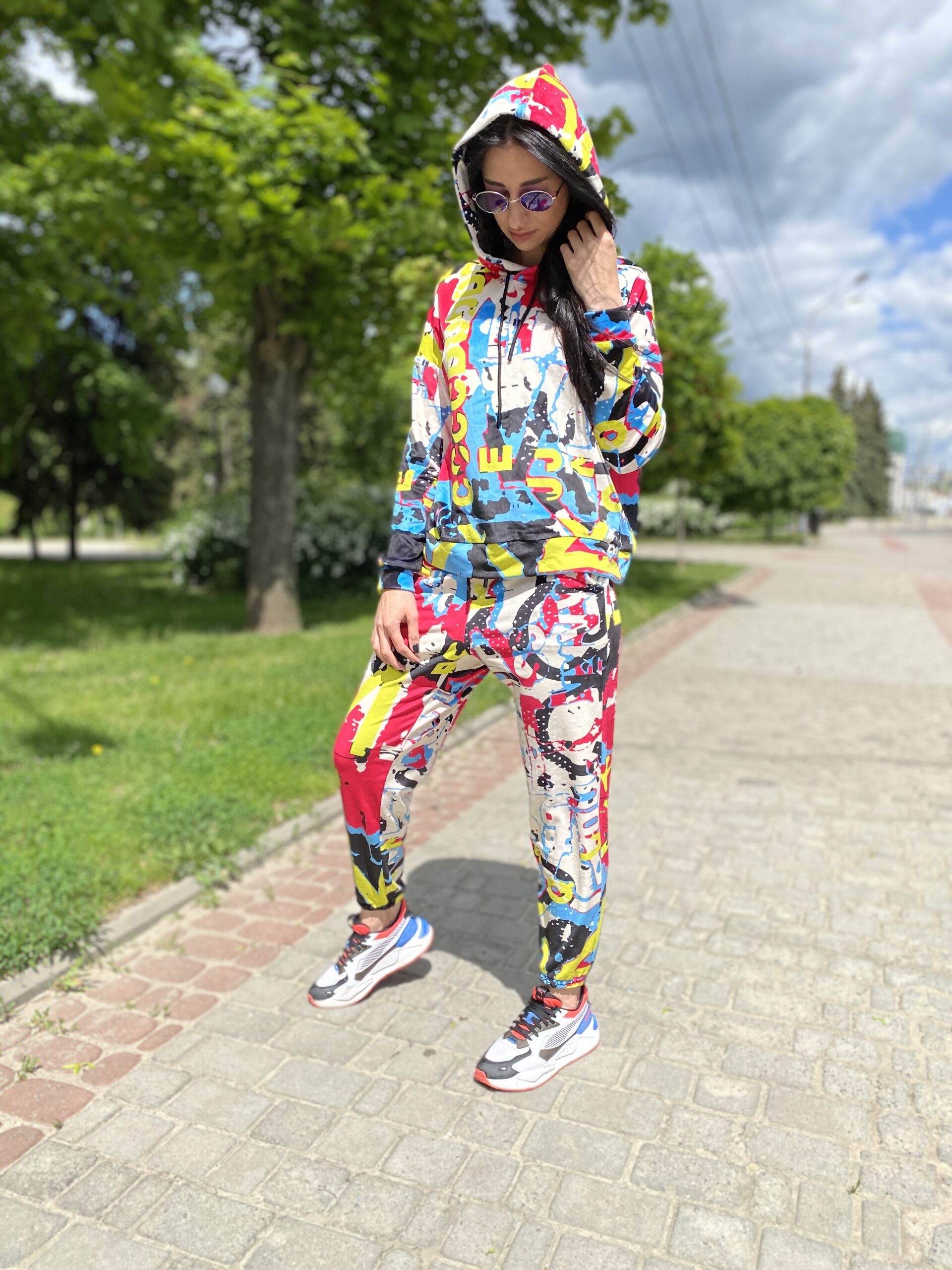 Худі вільного крою із капюшоном, без кишень, спущене плече, довжина по спинці – 65 см, довжина рукава від горловини — 73 см. Штани джогери, з еластичними резинками знизу, є кишені, довжина по зовнішньому шву від поясу 105 см. Шнурок на капюшоні.