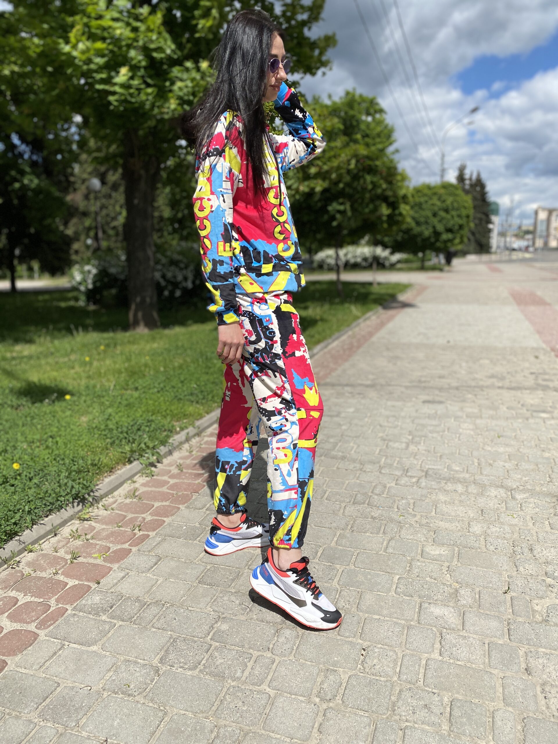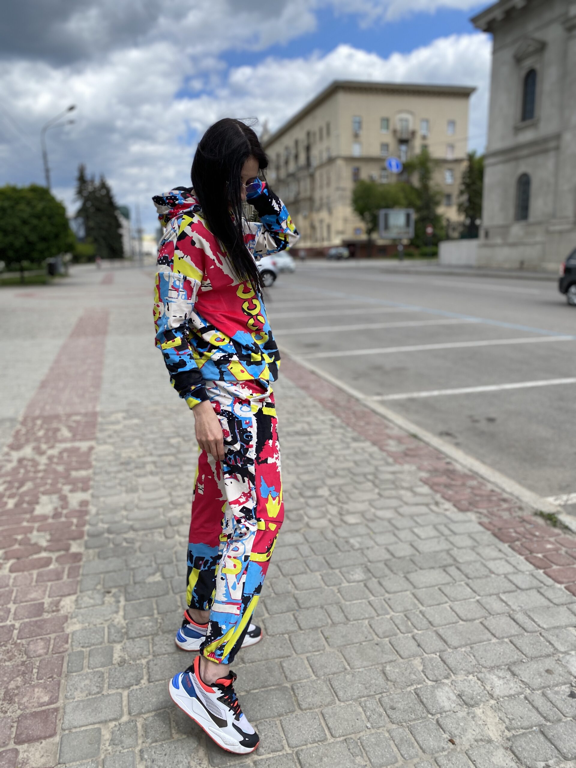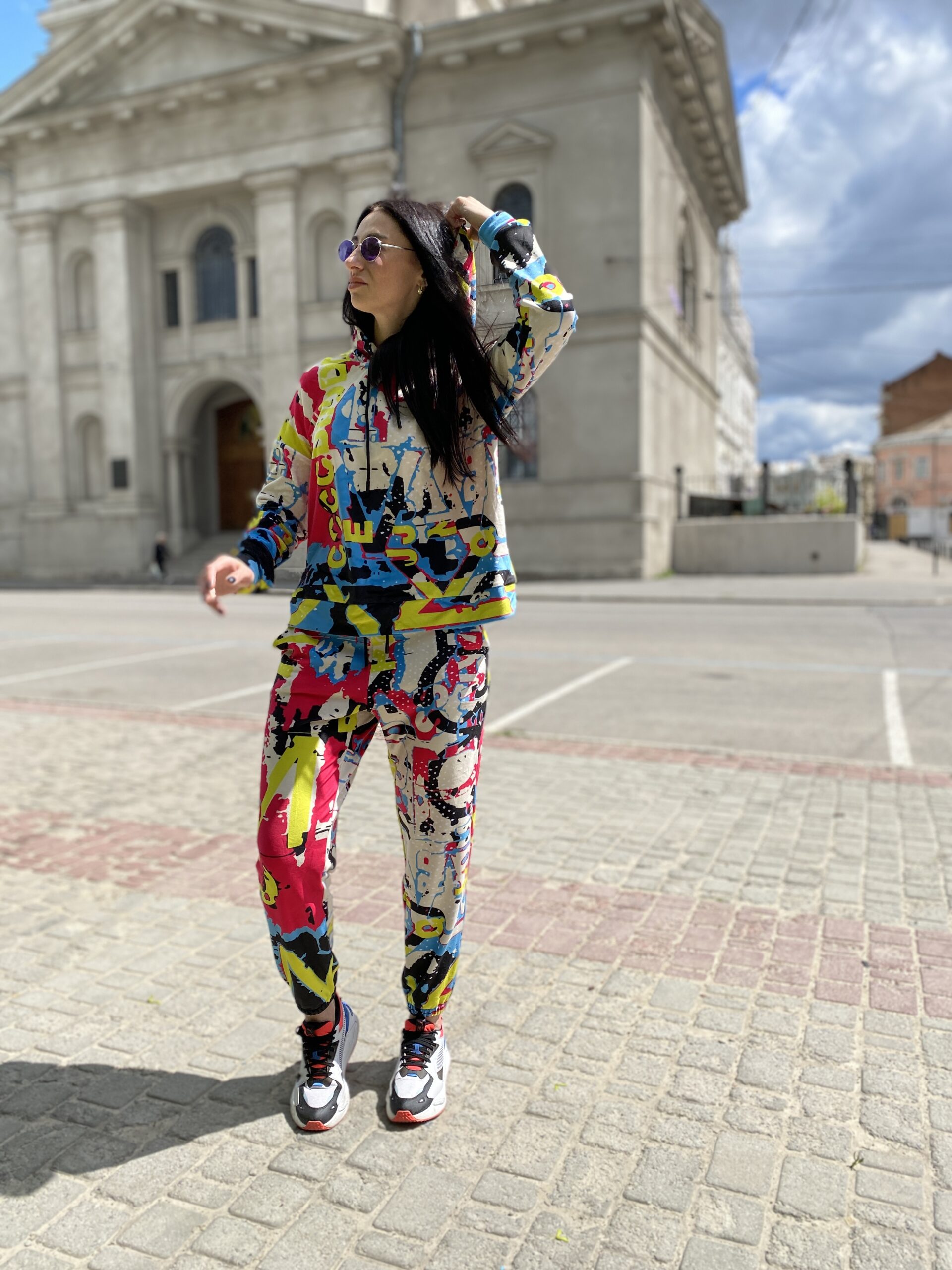Худі вільного крою із капюшоном, без кишень, спущене плече, довжина по спинці – 65 см, довжина рукава від горловини — 73 см. Штани джогери, з еластичними резинками знизу, є кишені, довжина по зовнішньому шву від поясу 105 см. Шнурок на капюшоні.