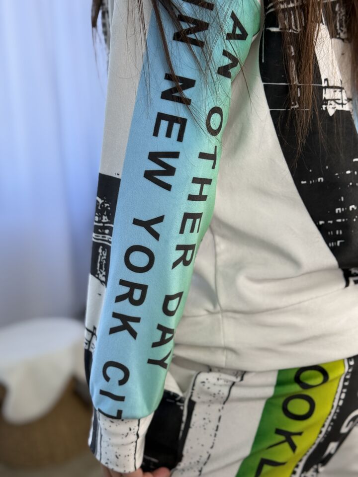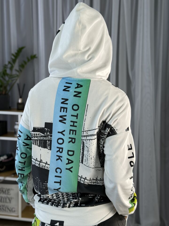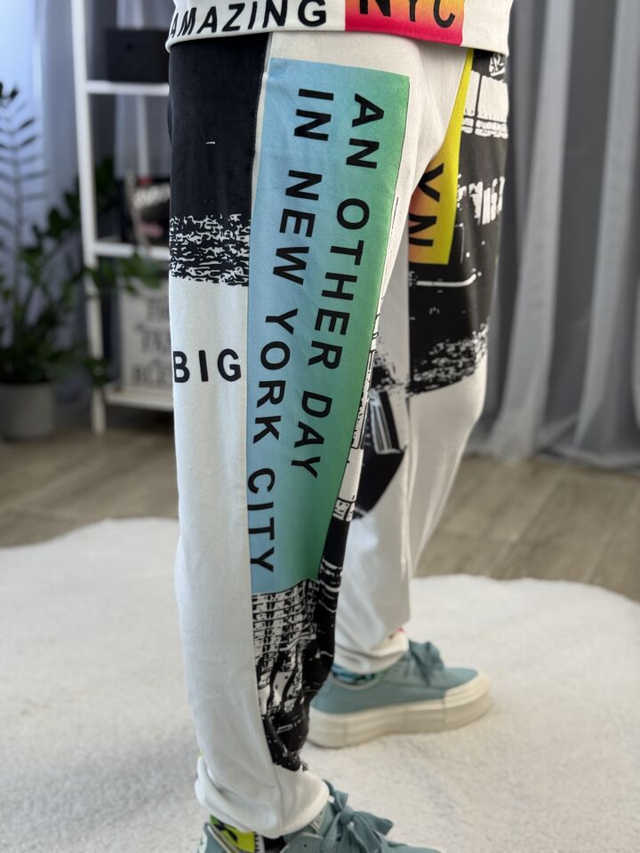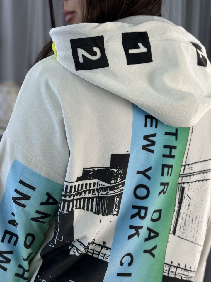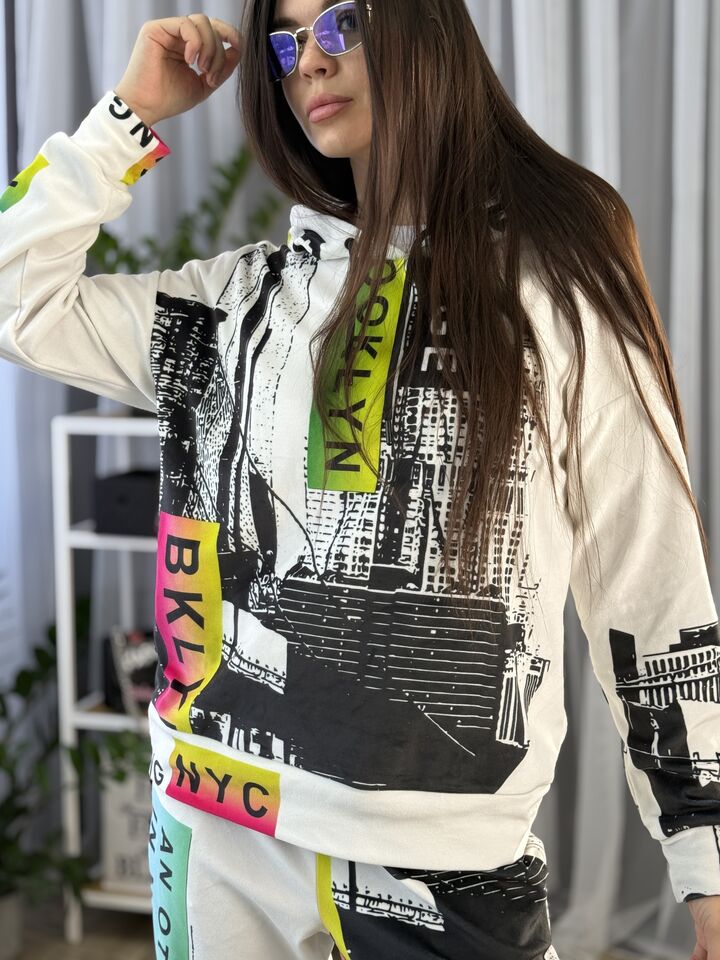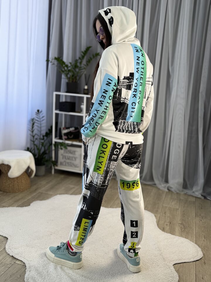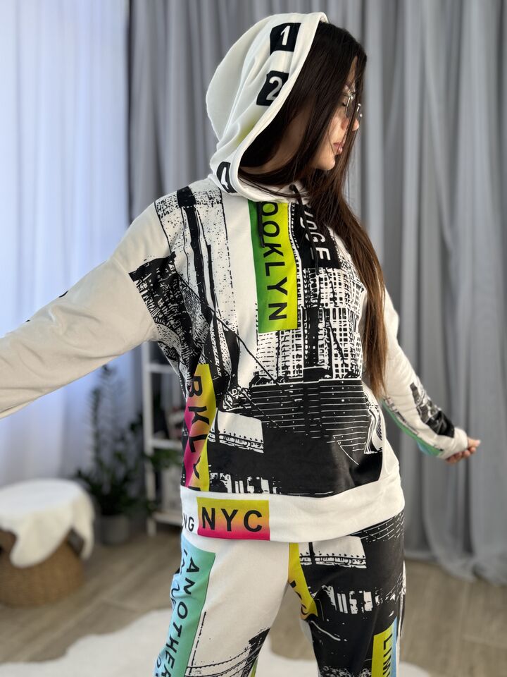 Худі вільного крою із капюшоном, без кишень, спущене плече, довжина по спинці – 65 см, довжина рукава від горловини — 73 см. Штани джогери, з еластичними резинками знизу, є кишені, довжина по зовнішньому шву від поясу 105 см. Шнурок на капюшоні.