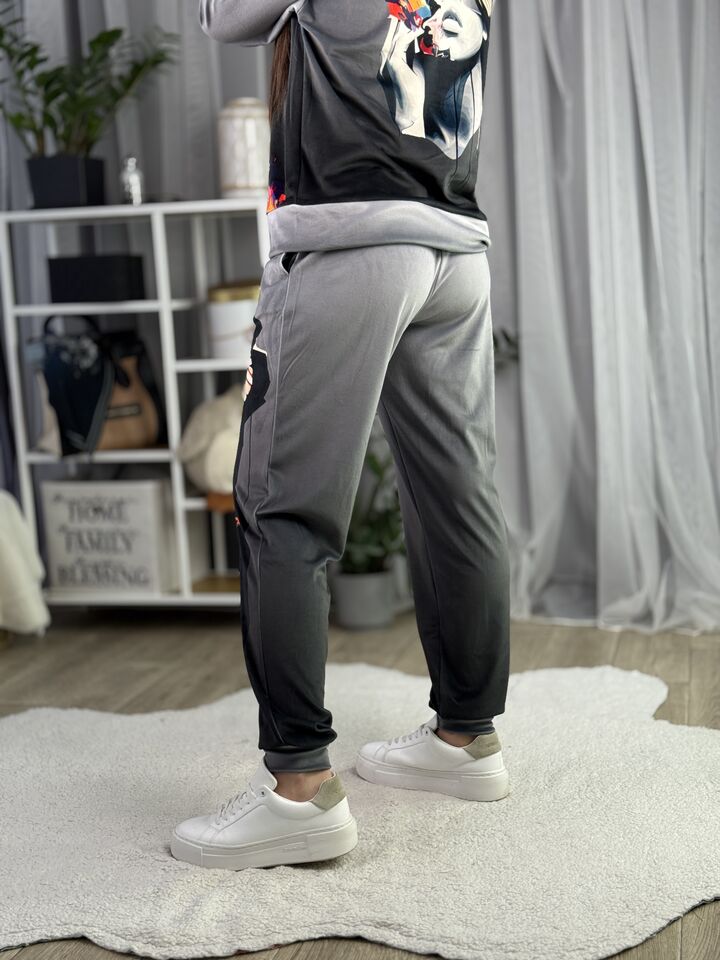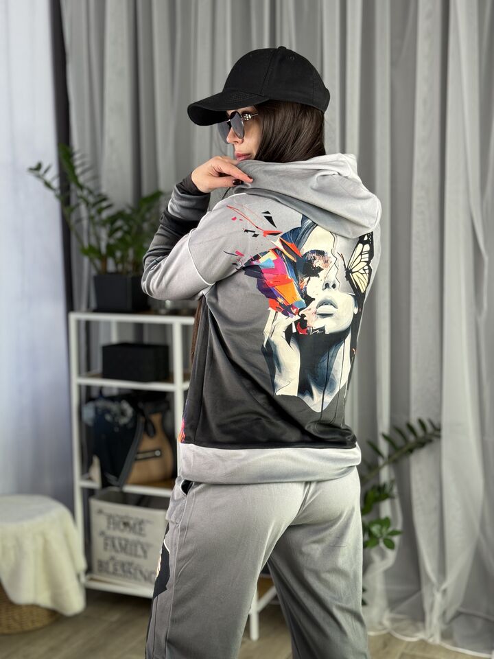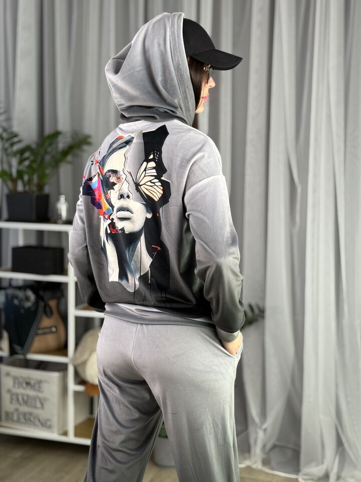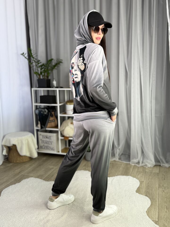Худі вільного крою із капюшоном, без кишень, спущене плече, довжина по спинці – 65 см, довжина рукава від горловини — 73 см. Штани джогери, з еластичними резинками знизу, є кишені, довжина по зовнішньому шву від поясу 105 см. Шнурок на капюшоні.