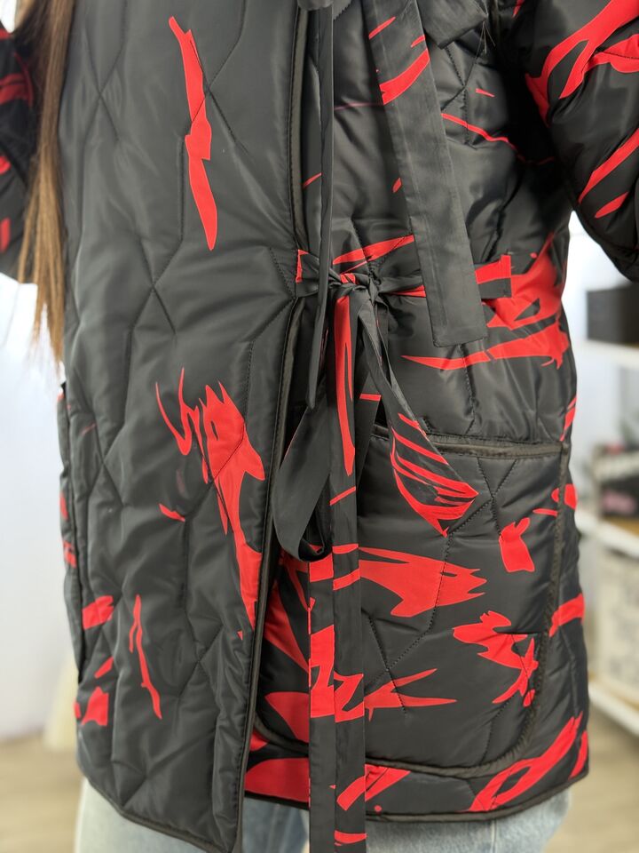 Прямого крою, зручна посадка на будь-який тип фігури, простьобане з обох боків, двостороннє: одна сторона — чорна, інша — у яскравому принті на вибір, функціональні кишені з обох боків, капюшон вшитий, об’ємний, застібається на кнопки, за потребою, можна зробити на стрічках, довжина виробу: 75 см, довжина рукава від горловини: 72 см, єврозима, температурний режим: до -10°C.