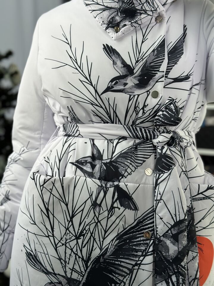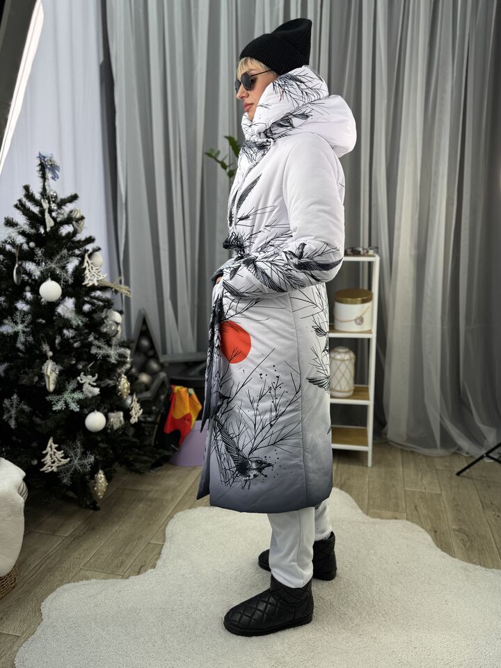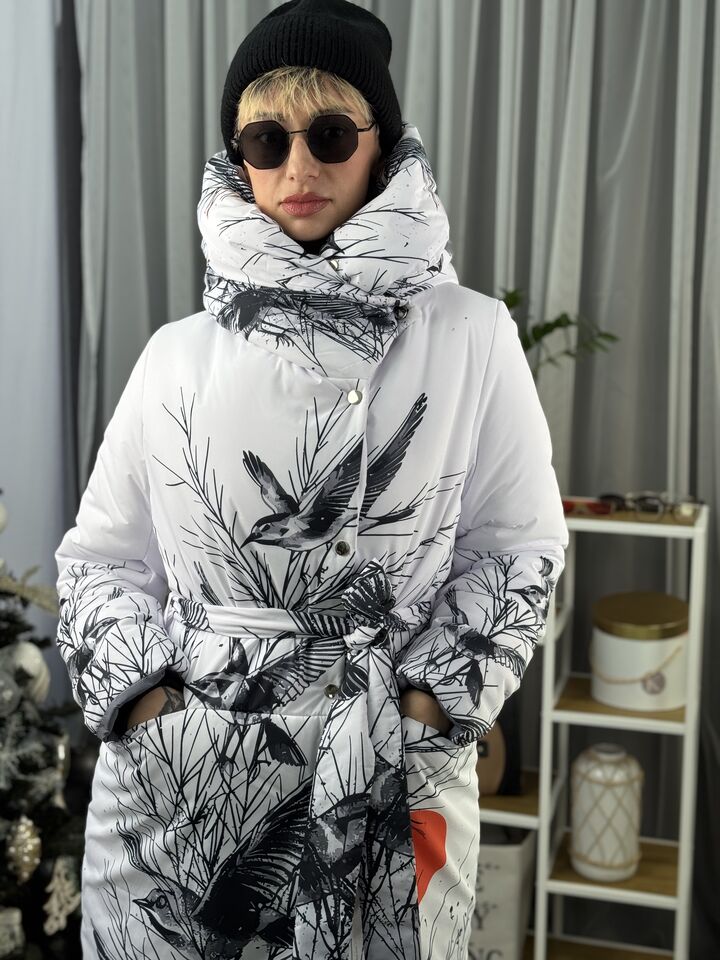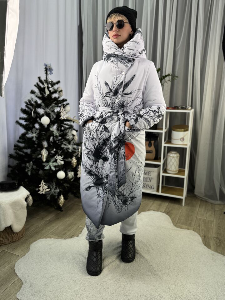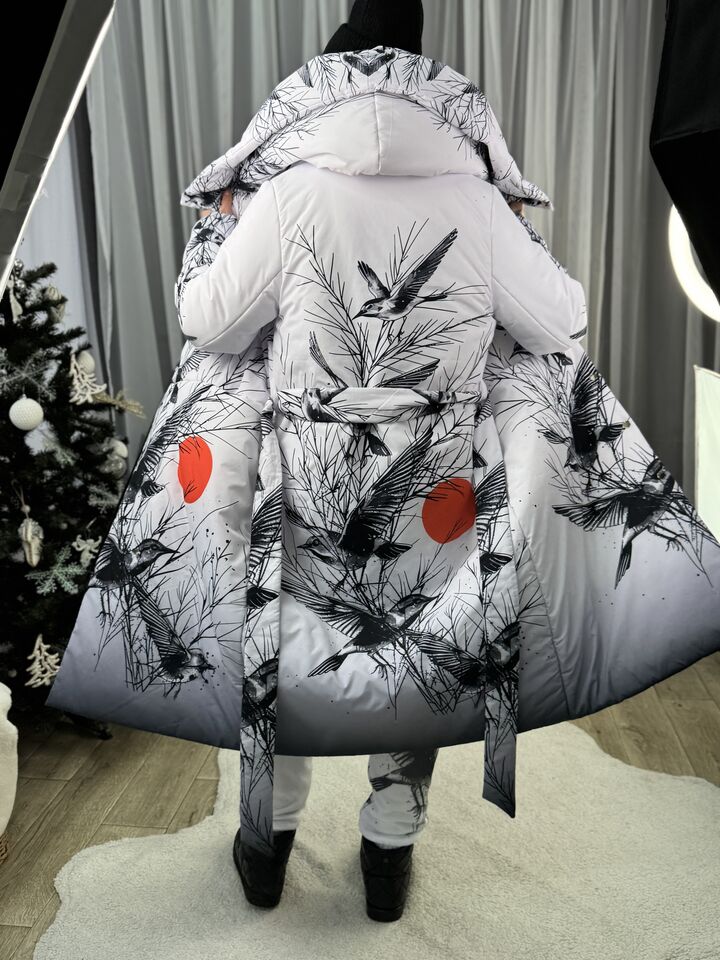 Прямий крій, зсередини двостороння блискавка – можна розстібати знизу, прорезинена – захищає від вологи, зверху – на запах, який фіксується кнопками, звичайний плечовий шов, рукава на прихованих манжетах, капюшон вшитий, об’ємний, є кишені, пасок у комплекті.  Довжина 118 см, довжина рукава від плечового шву 66 см, температурний режим до -20 градусів.