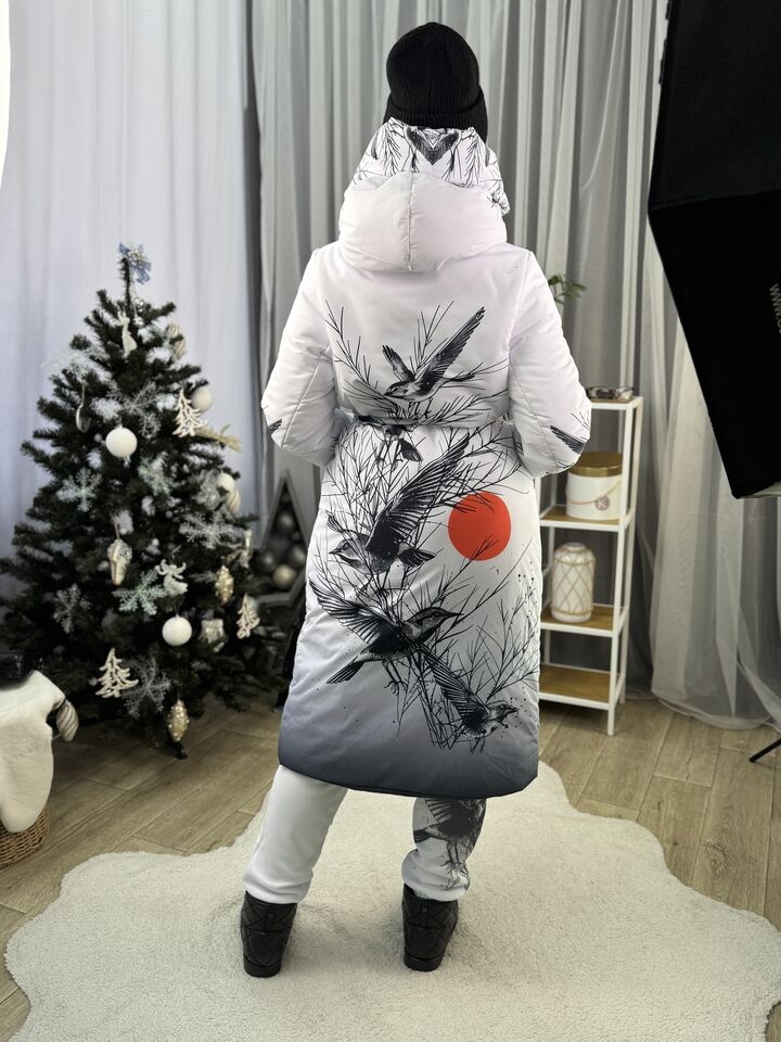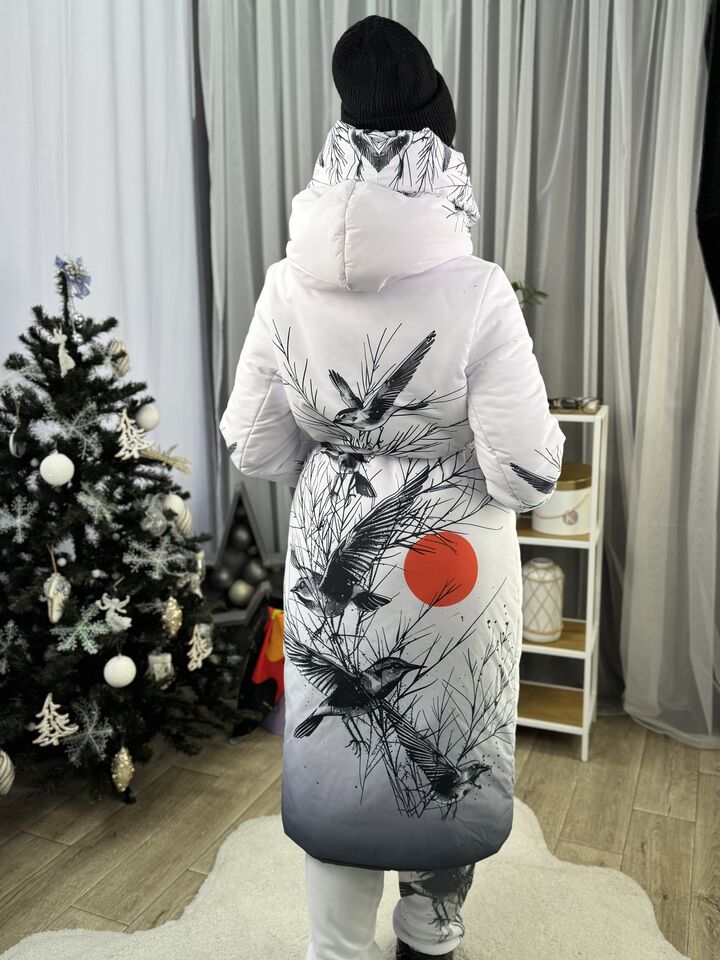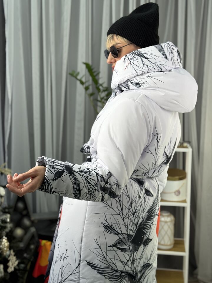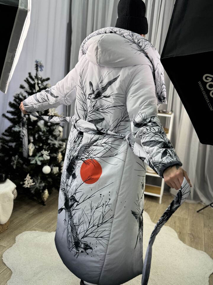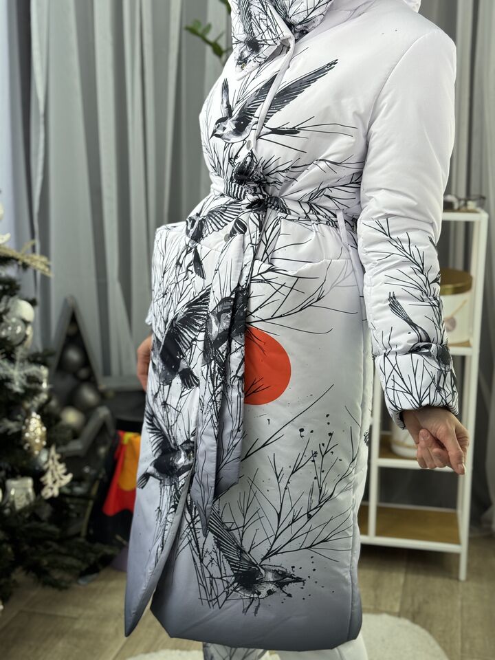 Прямий крій, зсередини двостороння блискавка – можна розстібати знизу, прорезинена – захищає від вологи, зверху – на запах, який фіксується кнопками, звичайний плечовий шов, рукава на прихованих манжетах, капюшон вшитий, об’ємний, є кишені, пасок у комплекті.  Довжина 118 см, довжина рукава від плечового шву 66 см, температурний режим до -20 градусів.