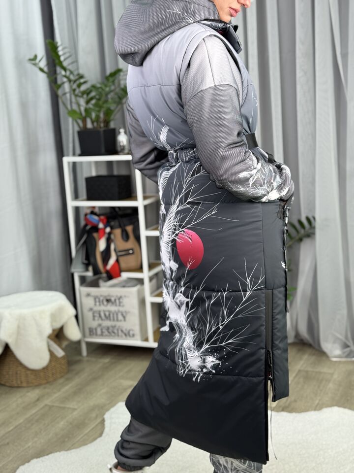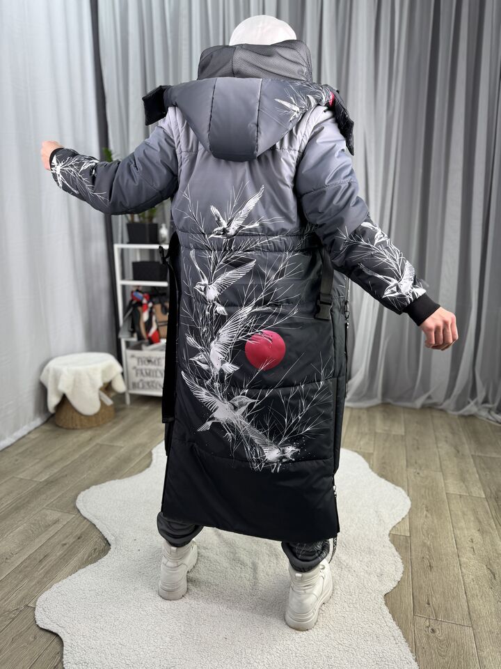 • Матеріал: плащівка • Сезон: єврозима (комфорт до −10°C) • Утеплювач: синтепух 150 г/м² • Капюшон/рукави: відстібаються • Довжина: 114/132 см (перед/спинка) • Догляд: прання 30°
