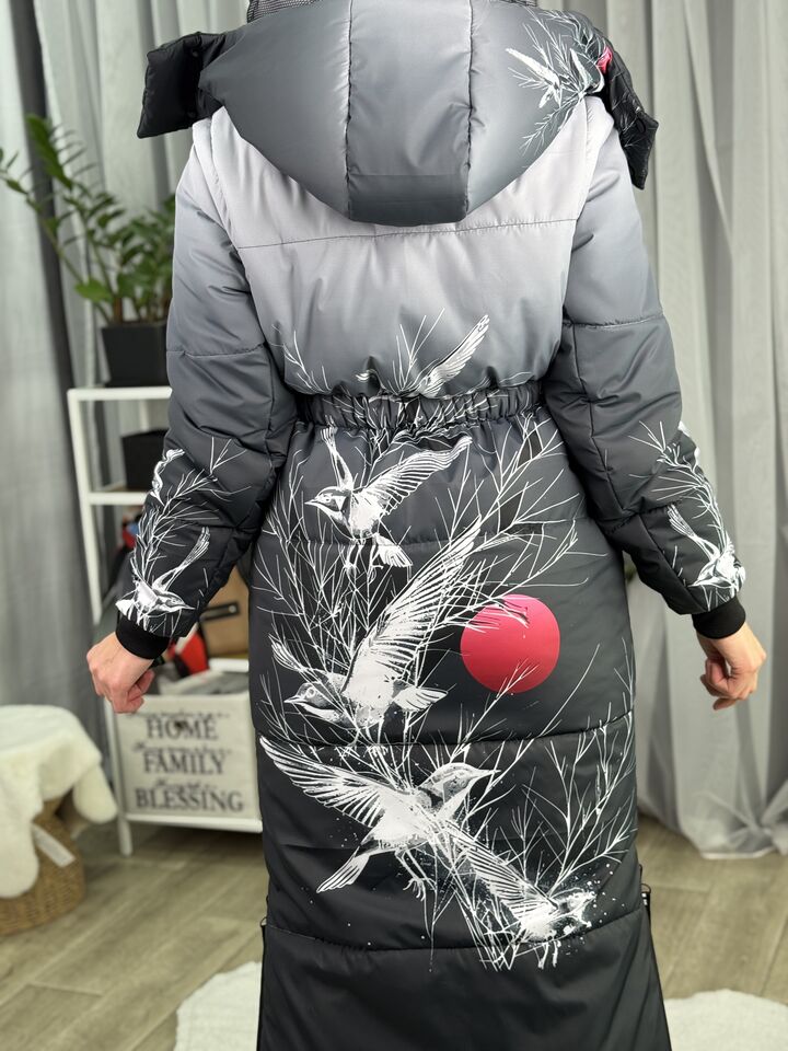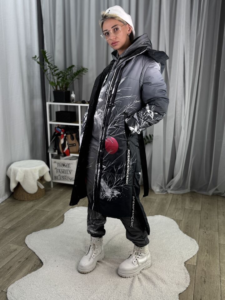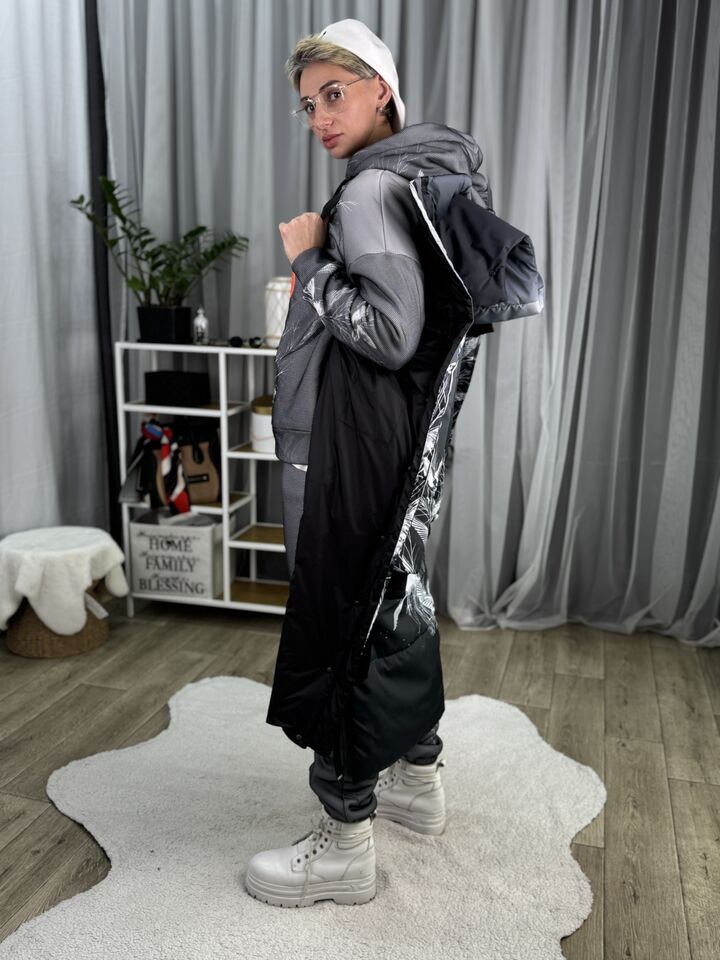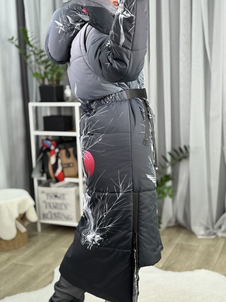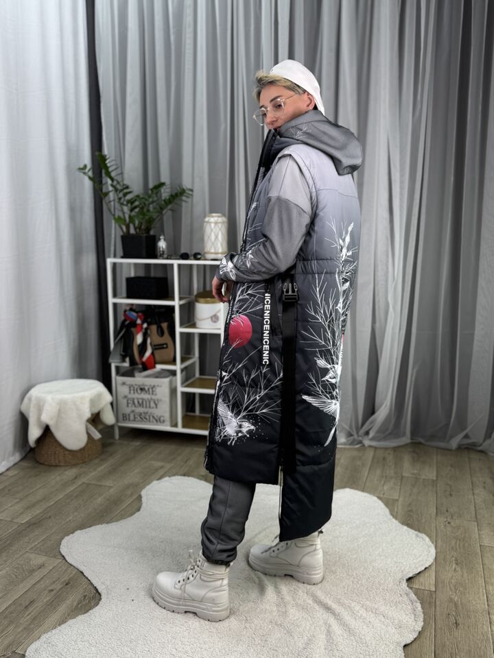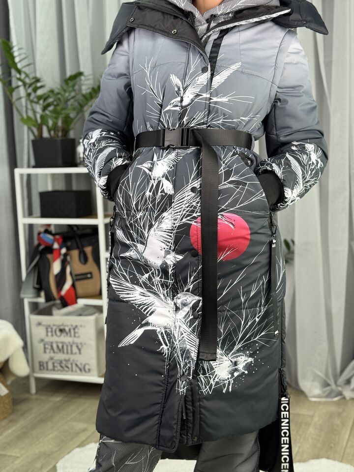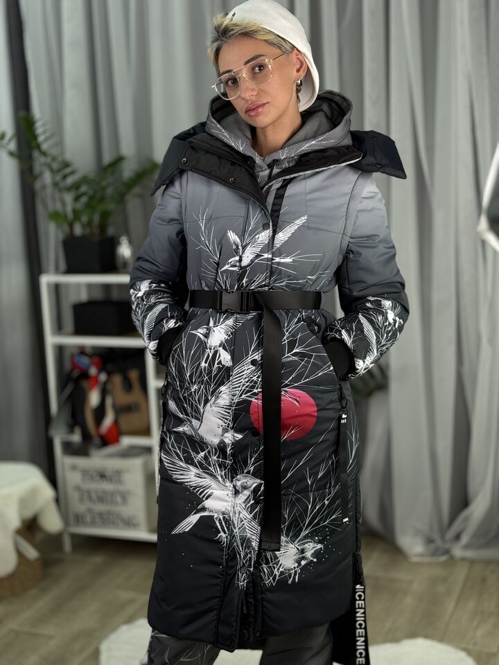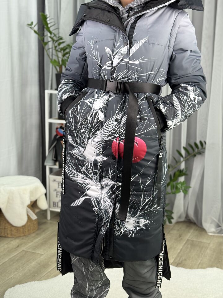 Прямий крій, блискавка двостороння – можна розстібати знизу, зверху планка із кнопками, рукава, на манжетах та відстібаються, капюшон – з’ємний, є бокові розрізи, на блискавках, можна розстібати для зручності при хотьбі, є кишені, пояс у комплекті, який підкреслює талію, всі блискавки прорезинені – захищають від дощу та снігу.  Довжина по переду 114 см, по спинці -132 см, довжина рукава 65 см по зовнішньому шву від плечового шву, це єврозима, температурний режим до -10 градусів.