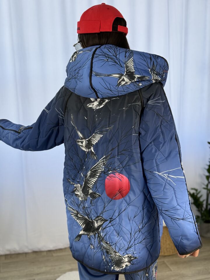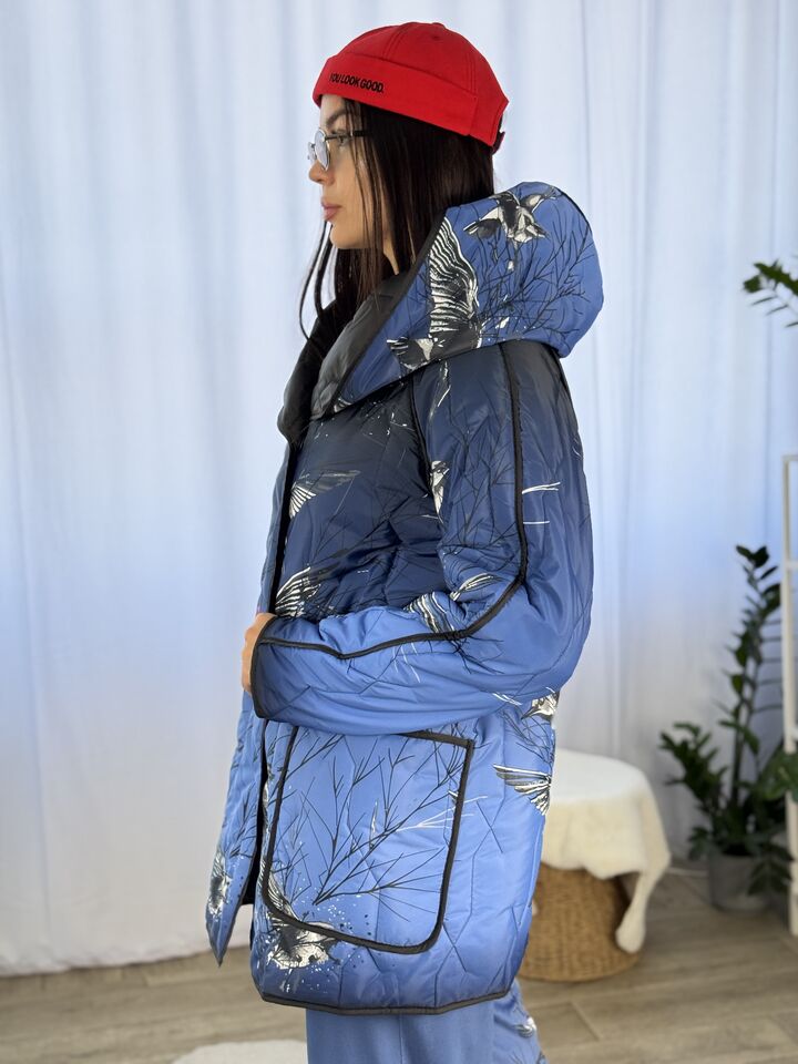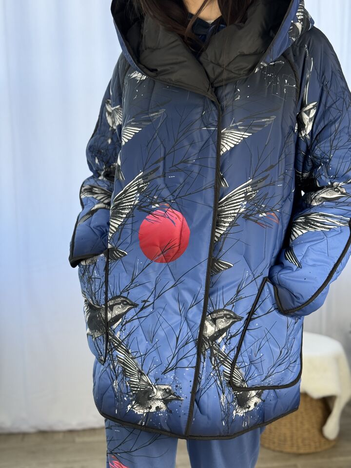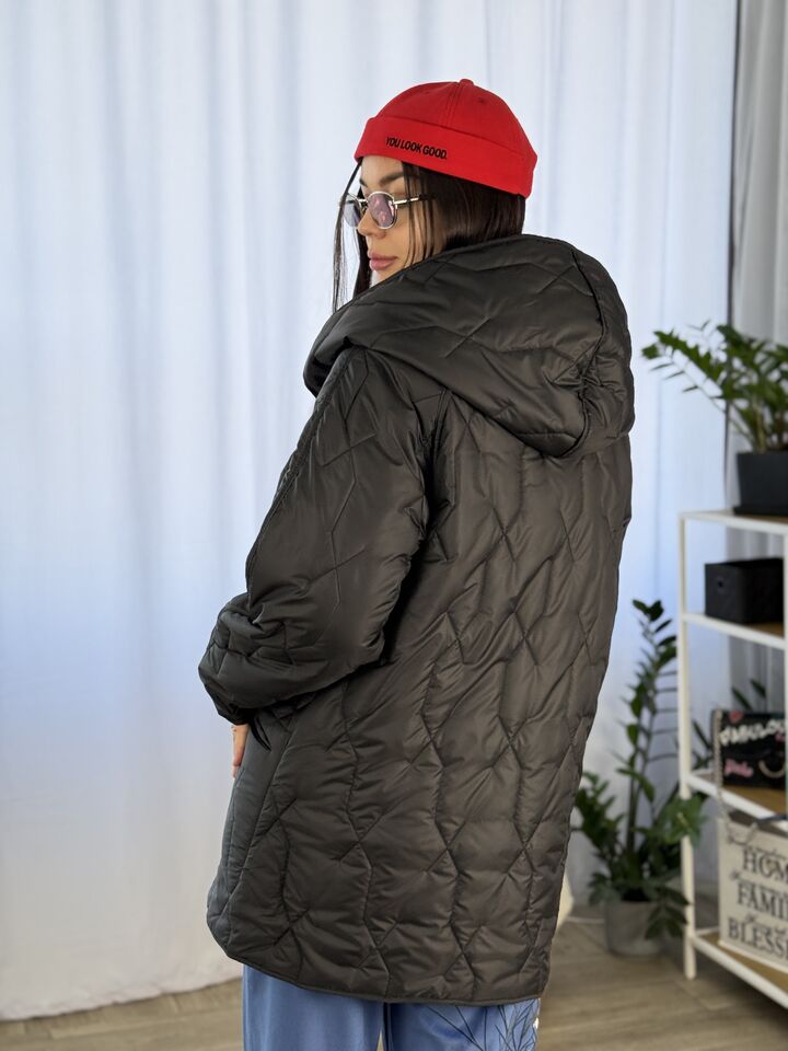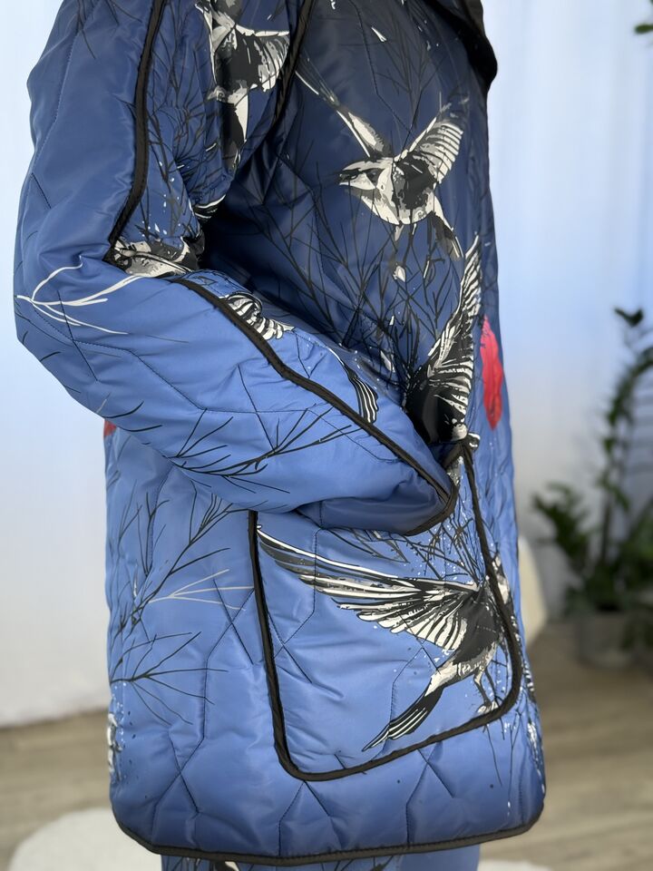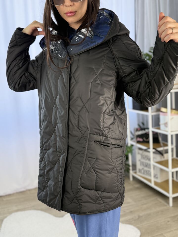 Прямого крою, зручна посадка на будь-який тип фігури, простьобане з обох боків, двостороннє: одна сторона — чорна, інша — у яскравому принті на вибір, функціональні кишені з обох боків, капюшон вшитий, об’ємний, застібається на кнопки, за потребою, можна зробити на стрічках, довжина виробу: 75 см, довжина рукава від горловини: 72 см, єврозима, температурний режим: до -10°C.