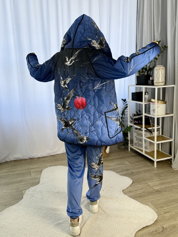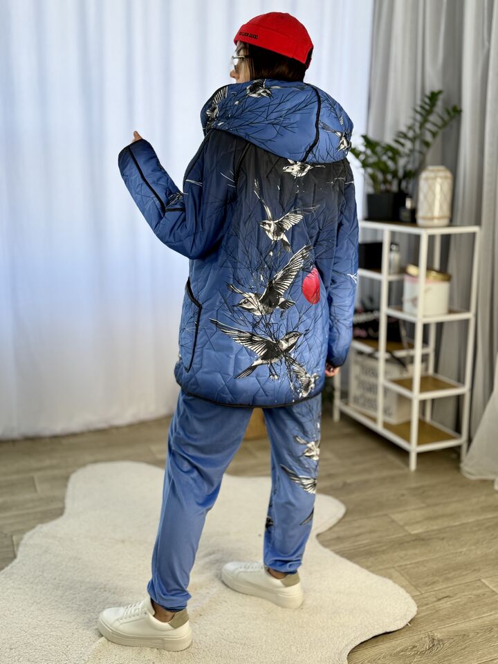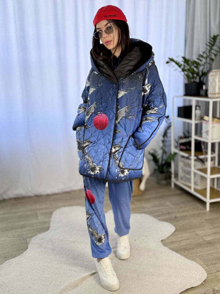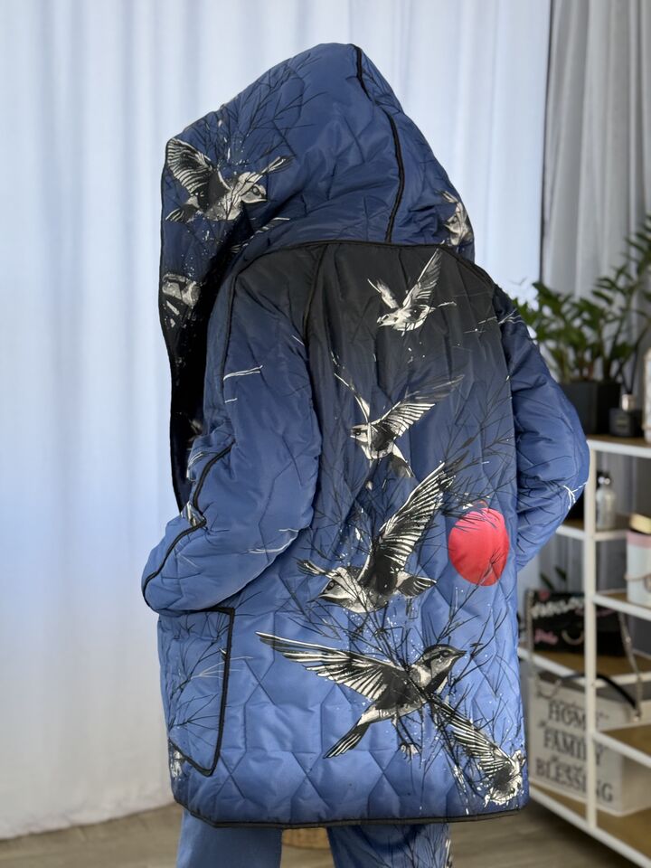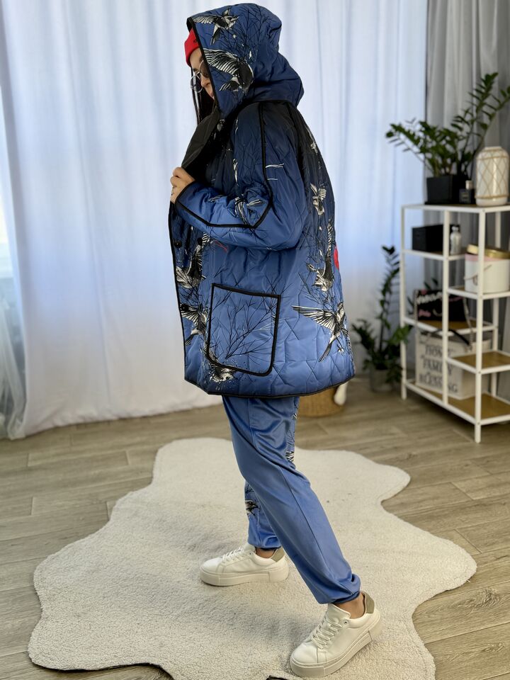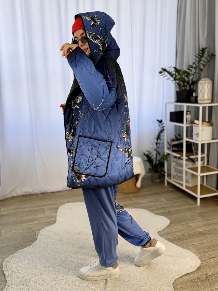 Прямого крою, зручна посадка на будь-який тип фігури, простьобане з обох боків, двостороннє: одна сторона — чорна, інша — у яскравому принті на вибір, функціональні кишені з обох боків, капюшон вшитий, об’ємний, застібається на кнопки, за потребою, можна зробити на стрічках, довжина виробу: 75 см, довжина рукава від горловини: 72 см, єврозима, температурний режим: до -10°C.