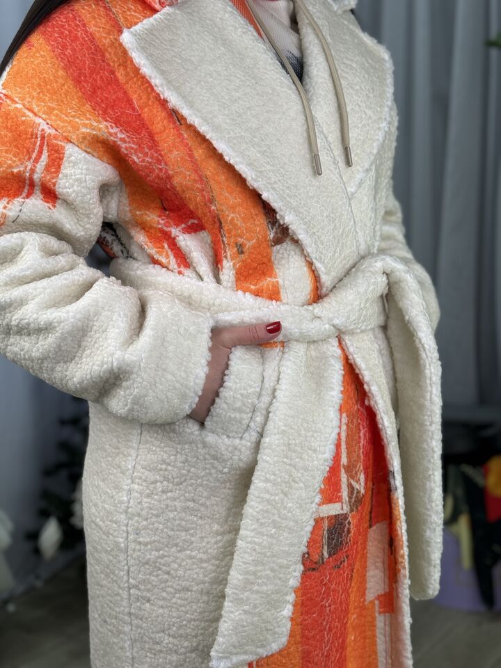 Прямий крій – комфортний, не сковує рухів, принтоване хутро тедді виглядає неординарно, на фоні звичного одягу, плечовий шов спущений, зав’язується на пасок, без блискавки, кнопок, без капюшона, є  кишені, довжина від вороту – 128 см, довжина рукава від горловини – 78 см, єврозима, температурний режим: до -10°C .