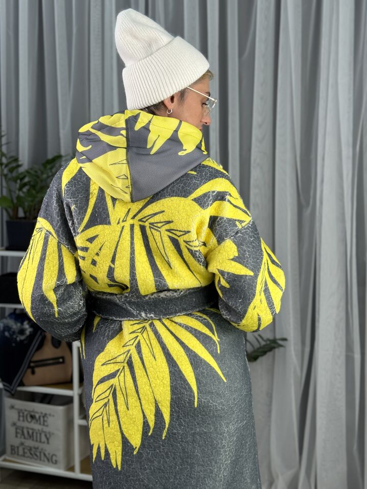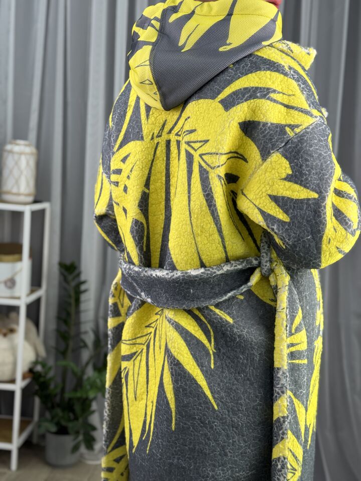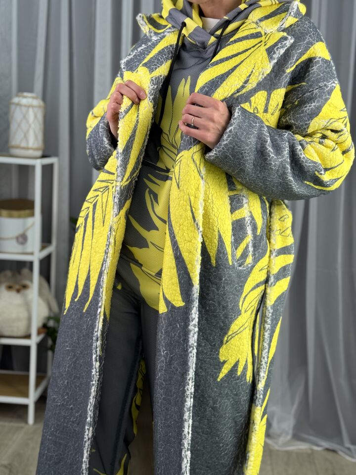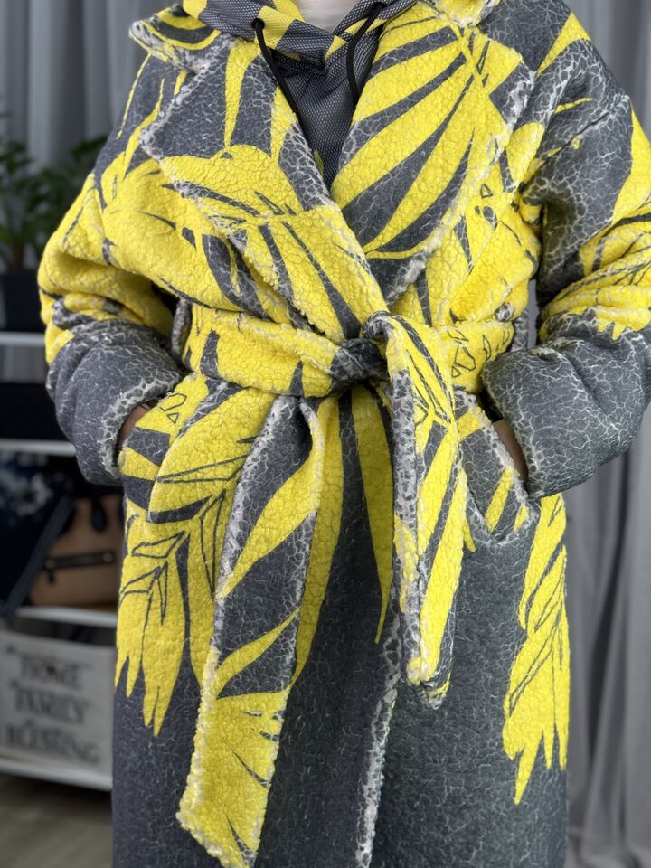 Жіноче зимове пальто із хутра тедді, сіре з жовтим листям