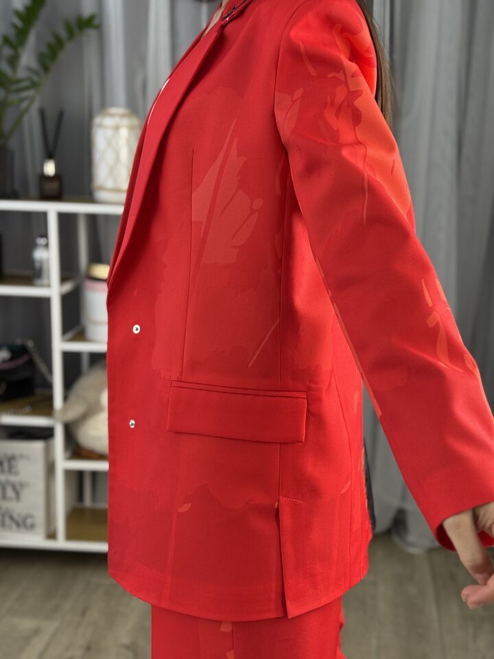 Жіночий костюм з авторським принтом — це сучасна класика з акцентом на стиль і комфорт. Складається з жакета вільного крою та брюк прямого силуету. Завдяки силуету oversize і продуманим деталям, комплект підходить як для ділового образу, так і для кежуал-виходів.