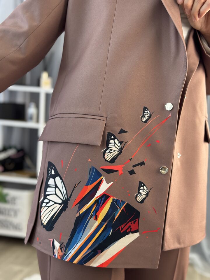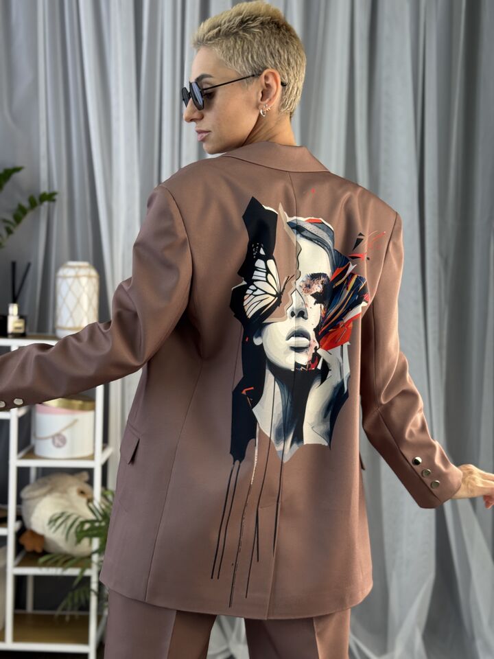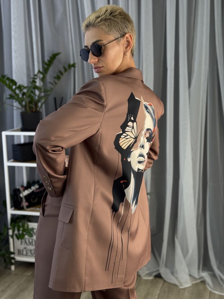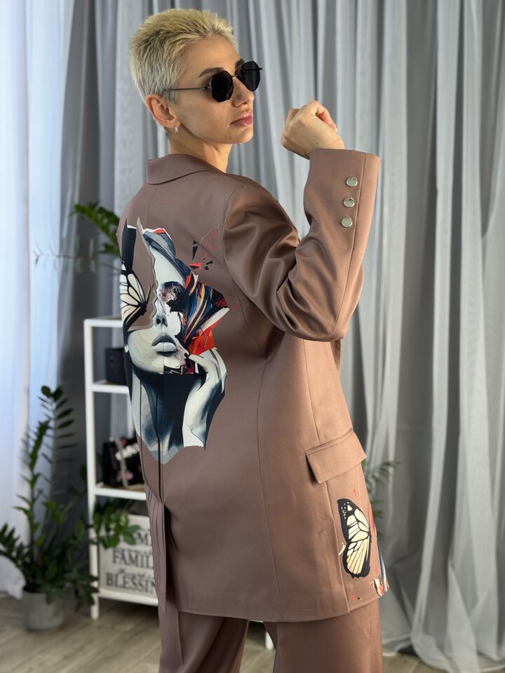 Жіночий костюм з авторським принтом — це сучасна класика з акцентом на стиль і комфорт. Складається з жакета вільного крою та брюк прямого силуету. Завдяки силуету oversize і продуманим деталям, комплект підходить як для ділового образу, так і для кежуал-виходів.
