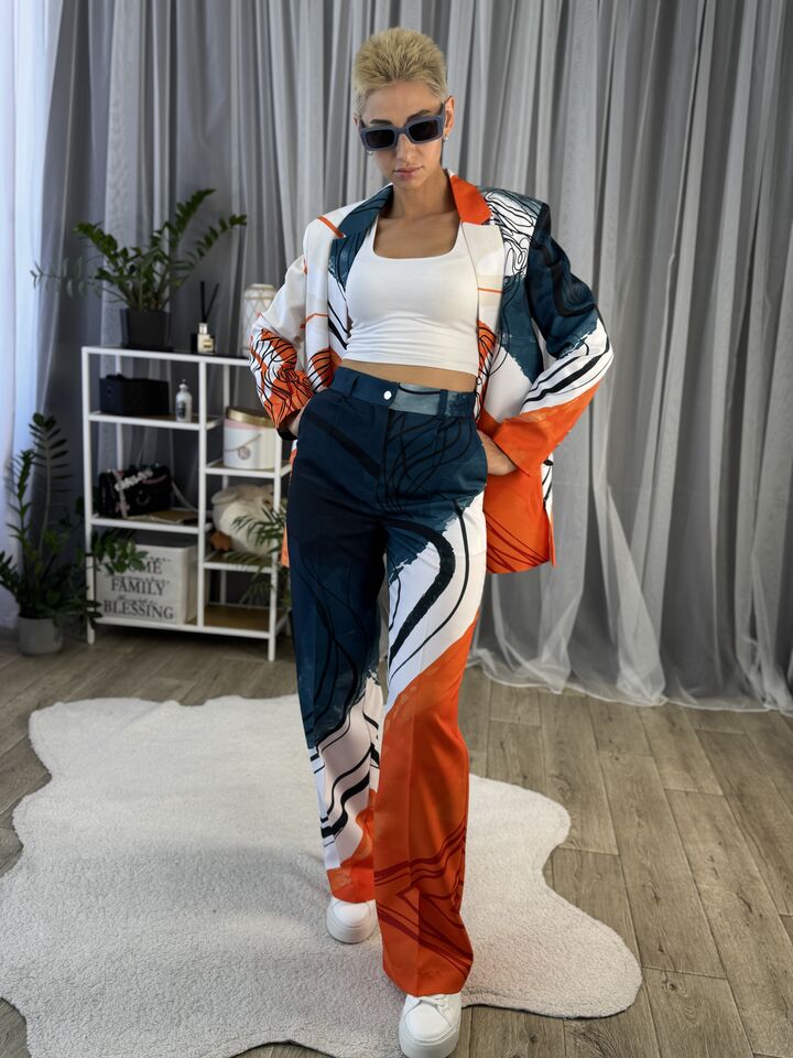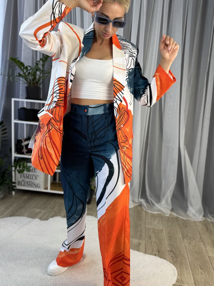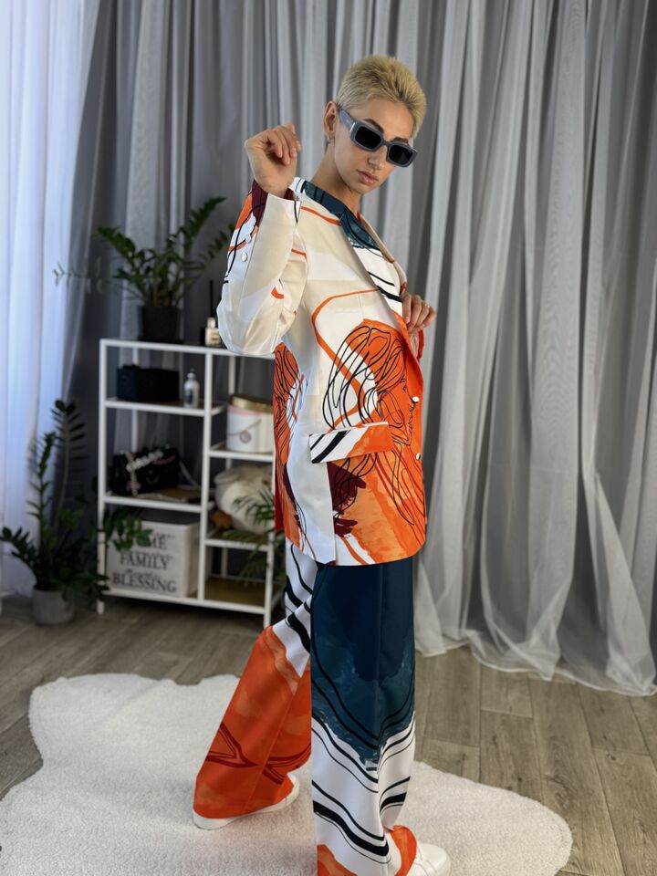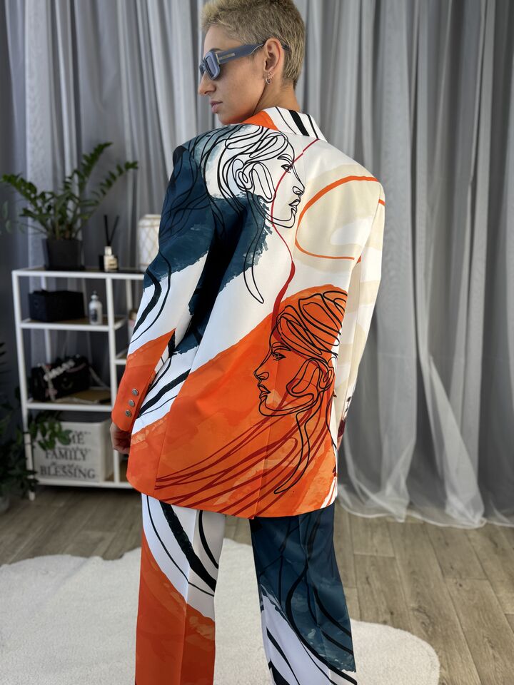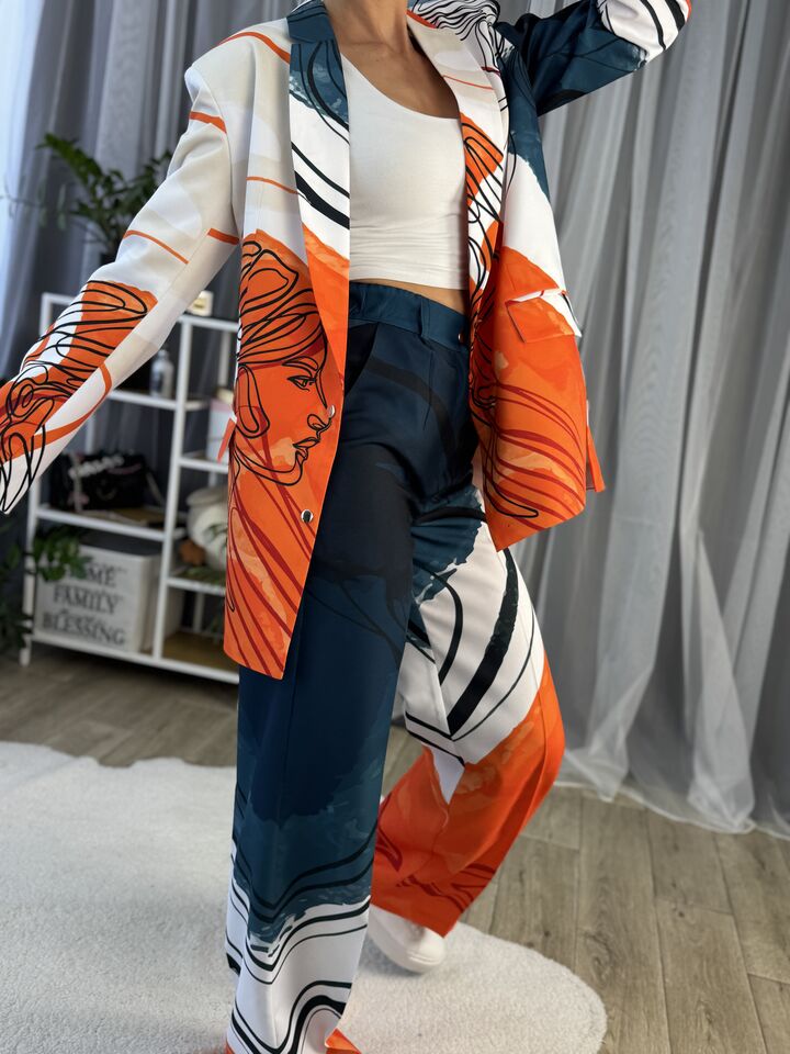 Жіночий костюм з авторським принтом — це сучасна класика з акцентом на стиль і комфорт. Складається з жакета вільного крою та брюк прямого силуету. Завдяки силуету oversize і продуманим деталям, комплект підходить як для ділового образу, так і для кежуал-виходів.