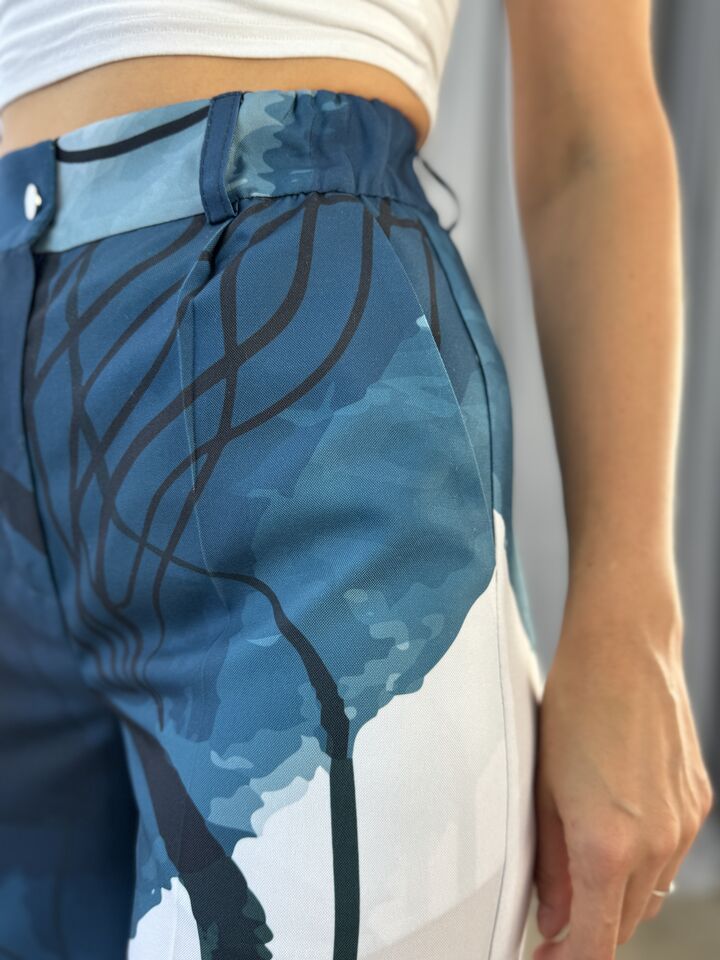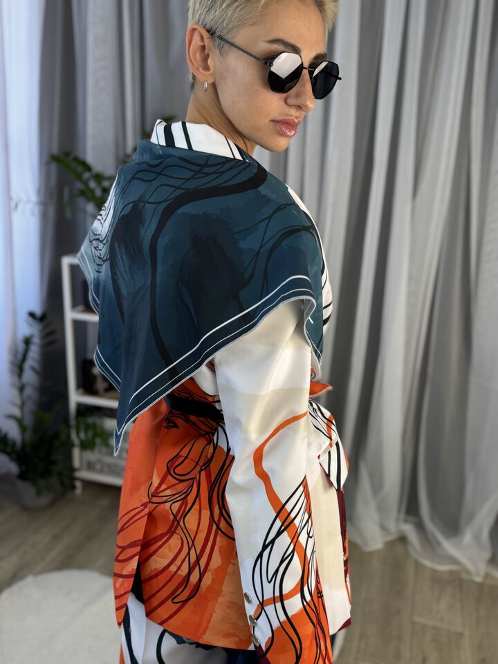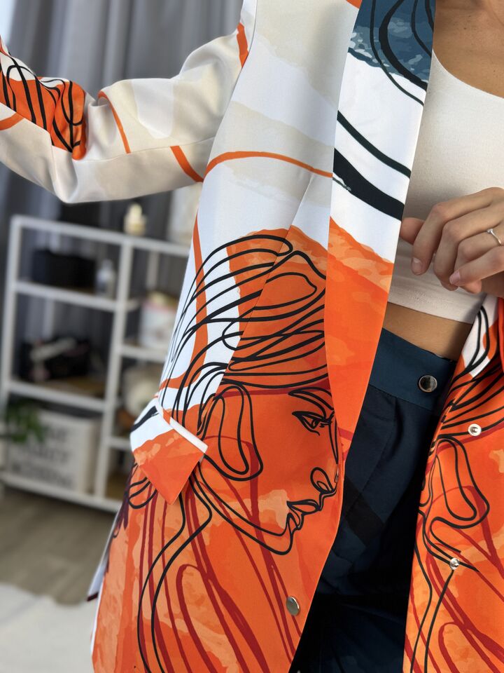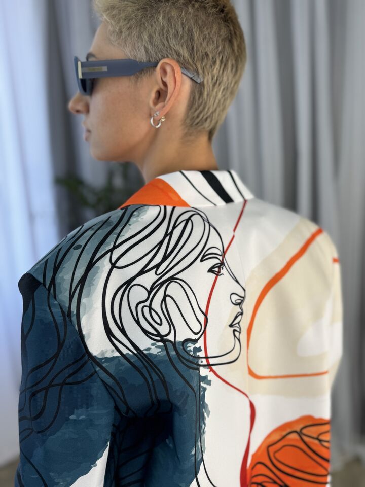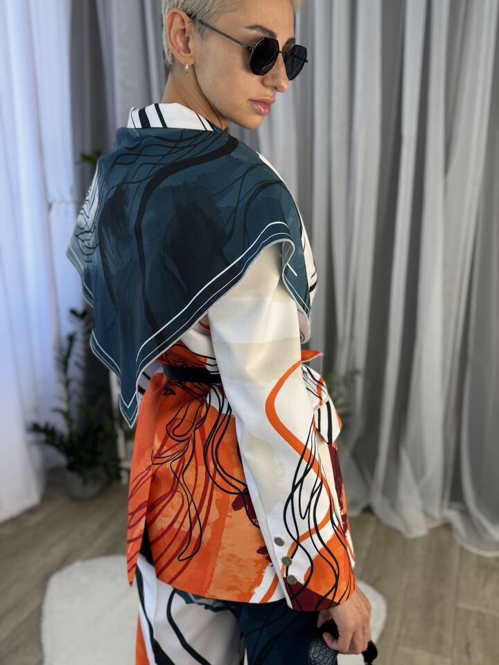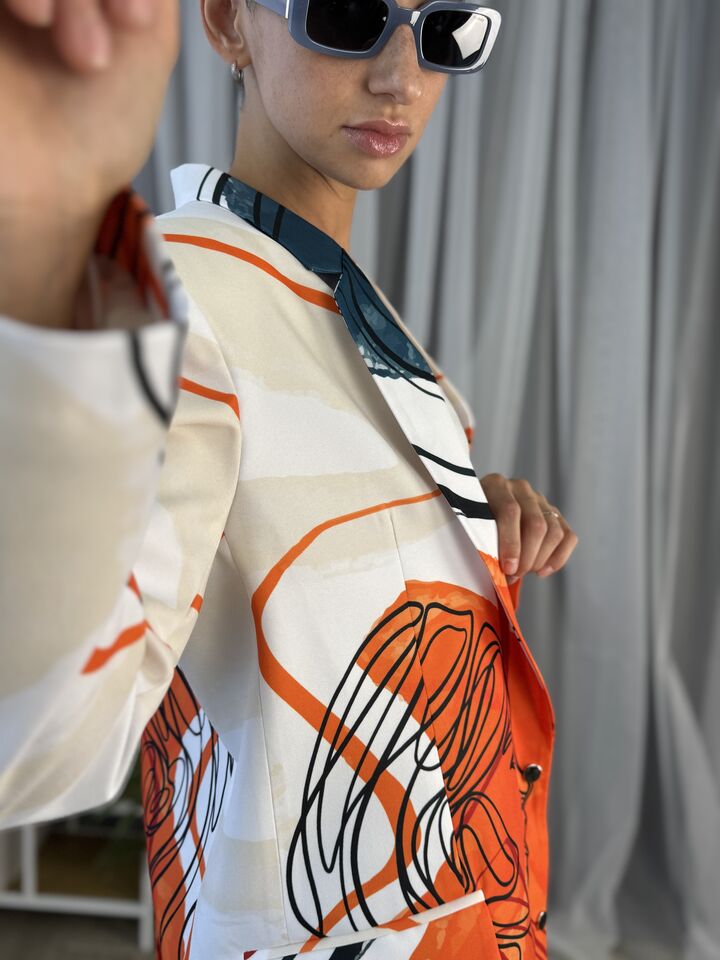 Жіночий костюм з авторським принтом — це сучасна класика з акцентом на стиль і комфорт. Складається з жакета вільного крою та брюк прямого силуету. Завдяки силуету oversize і продуманим деталям, комплект підходить як для ділового образу, так і для кежуал-виходів.