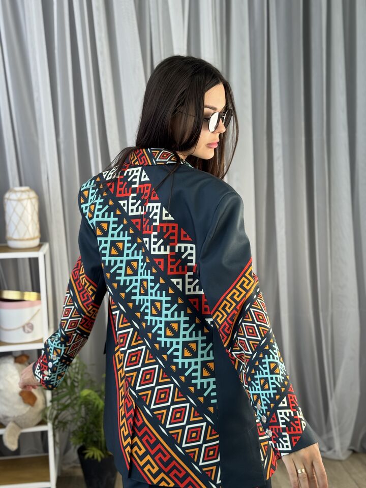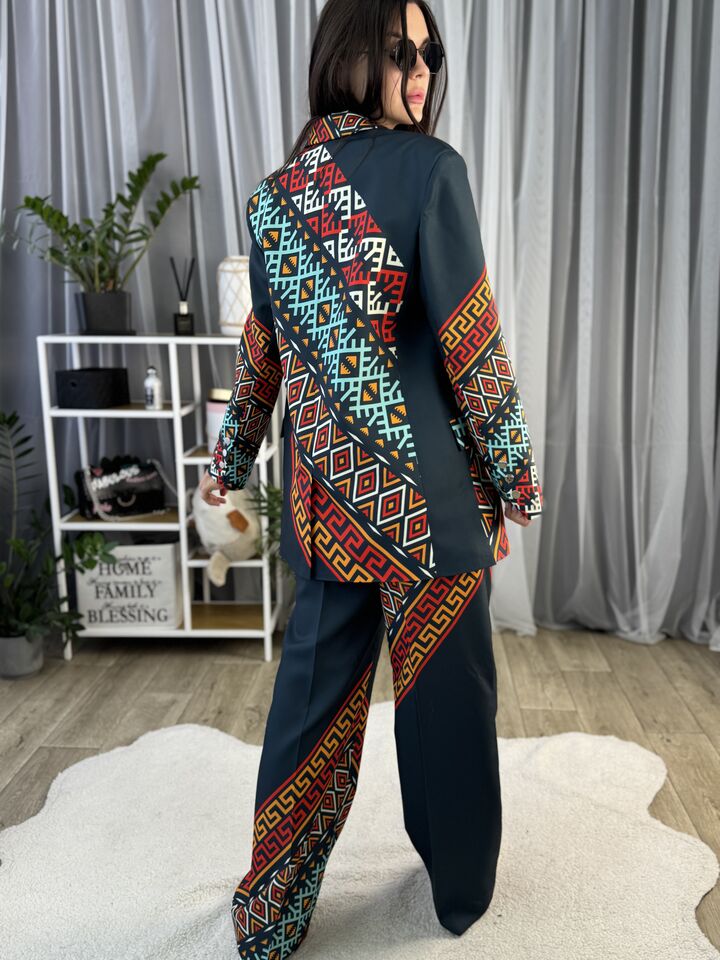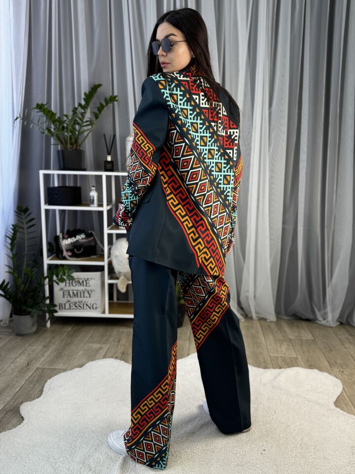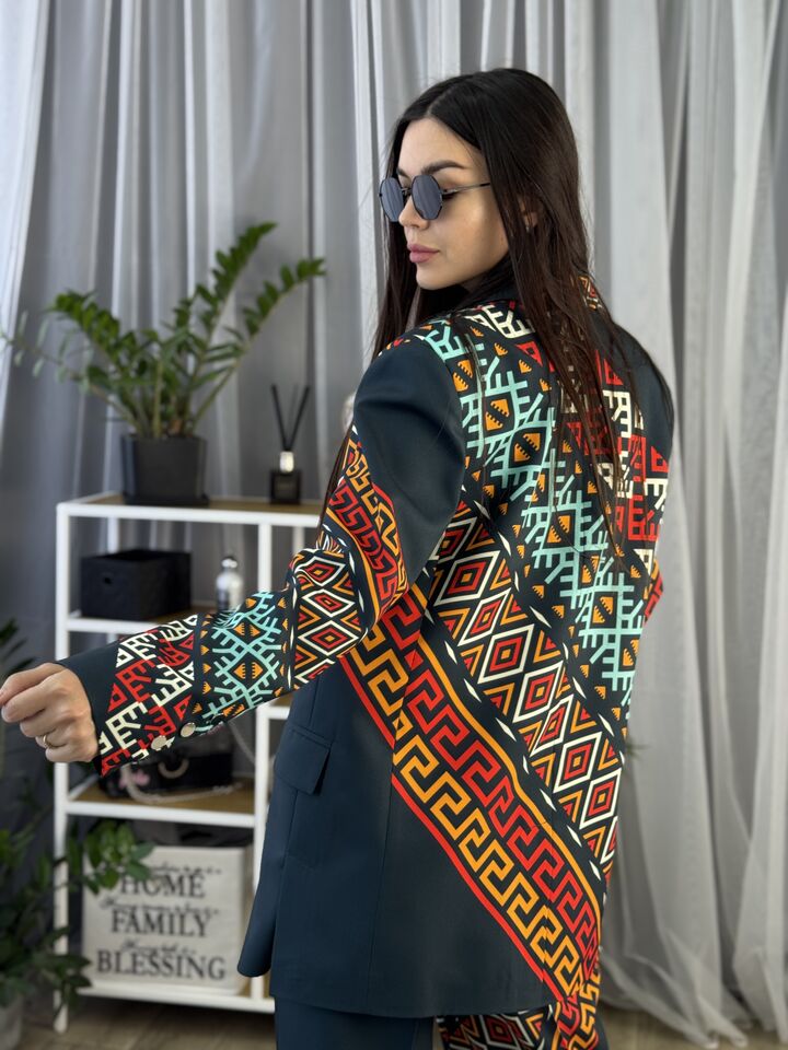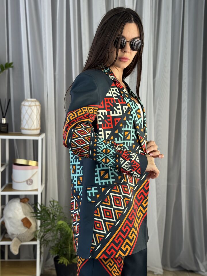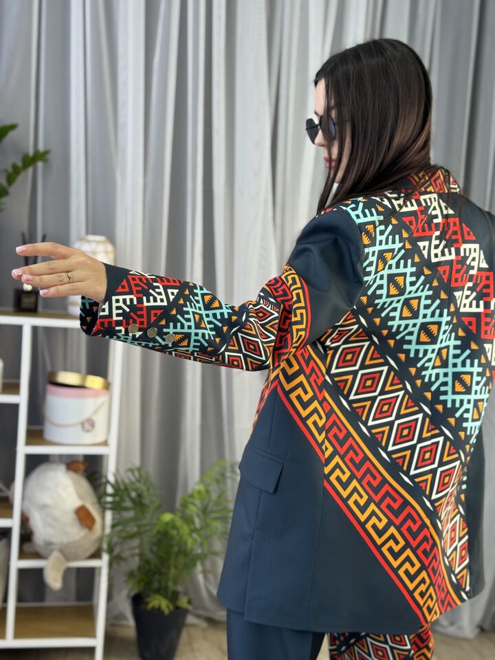 Жіночий костюм з авторським принтом — це сучасна класика з акцентом на стиль і комфорт. Складається з жакета вільного крою та брюк прямого силуету. Завдяки силуету oversize і продуманим деталям, комплект підходить як для ділового образу, так і для кежуал-виходів.