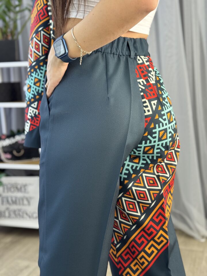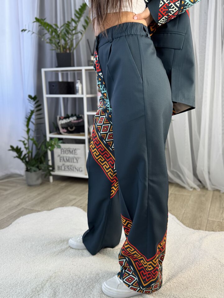 Жіночий брючний костюм, зелений із орнаментом