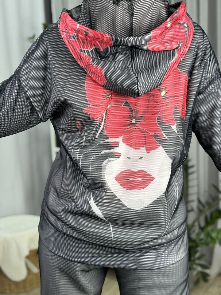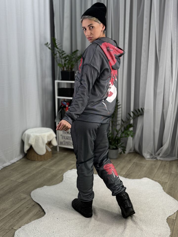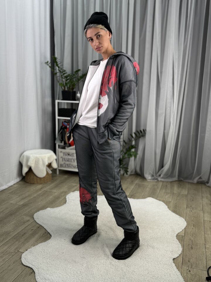Худі вільного крою із капюшоном на блискавці, кишені є, плечовий шов спущений, довжина по спинці – 70 см, довжина рукава від горловини — 73 см. Фасон штанів – джогери із еластичною резинкою знизу, є кишені, довжина по зовнішньому шву від поясу 105 см.