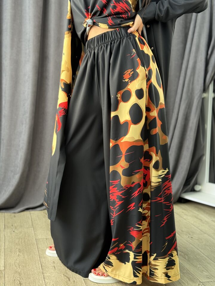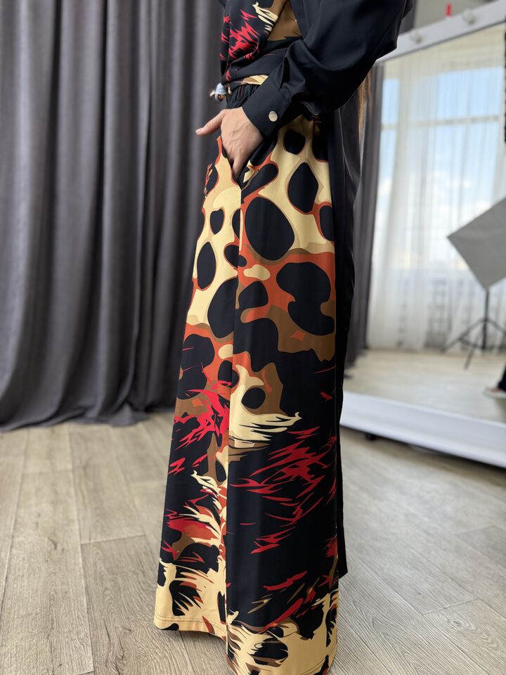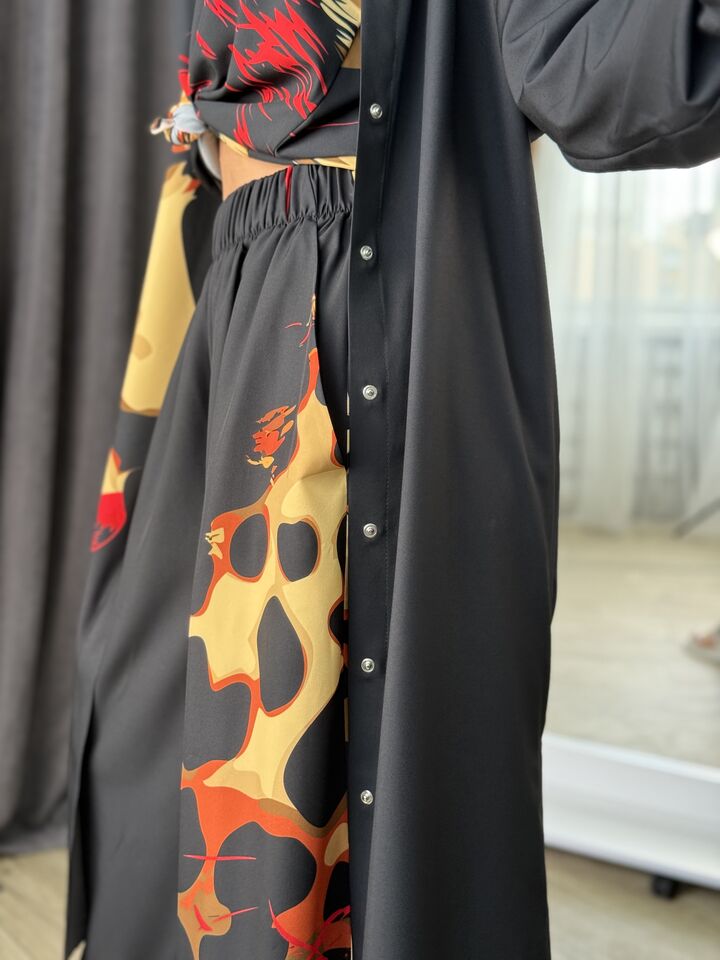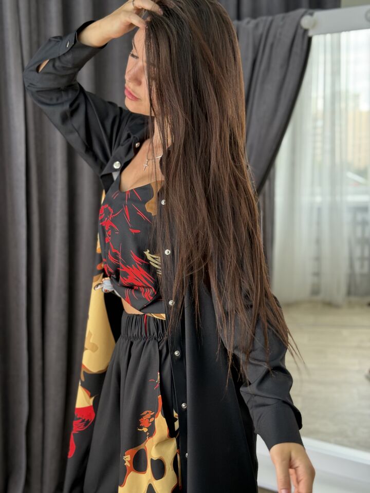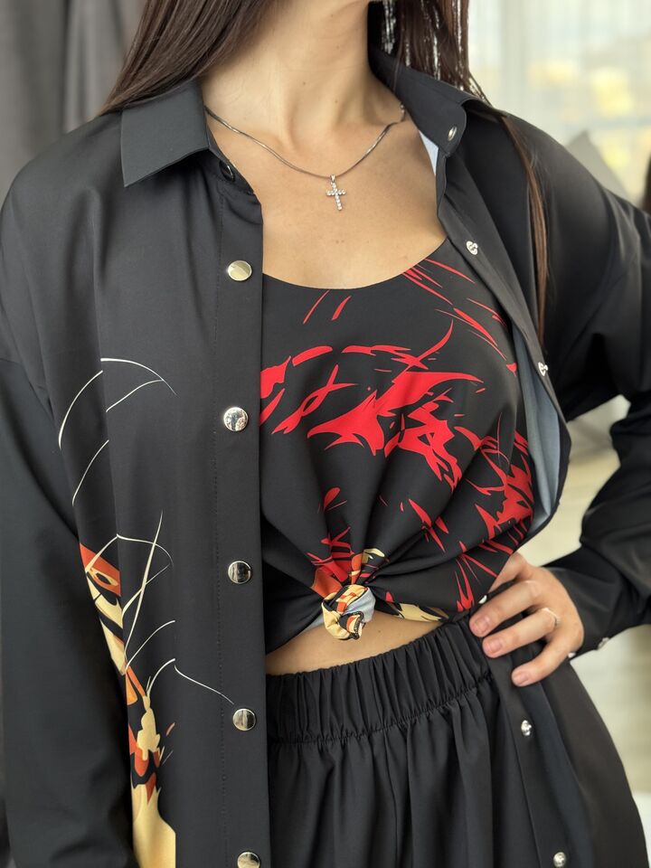 Унікальний жіночий комплект, що складається з брюк, майки на регульованих бретелях і довгої сорочки. Це не просто одяг — це три варіанти стильних образів в одному комплекті: