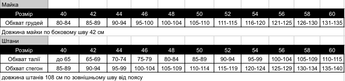 • Довжина штанів — 108 см боковому шву