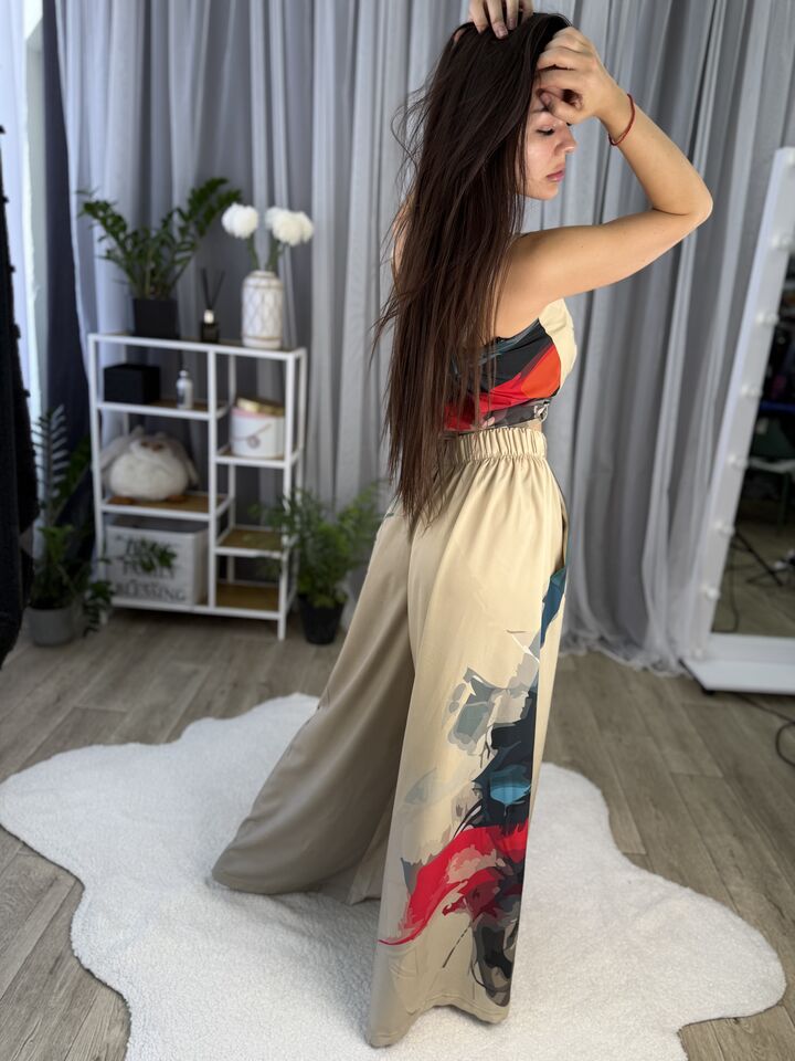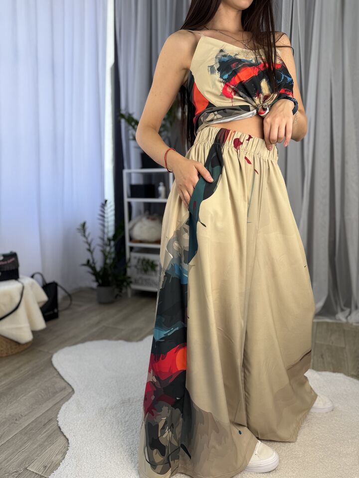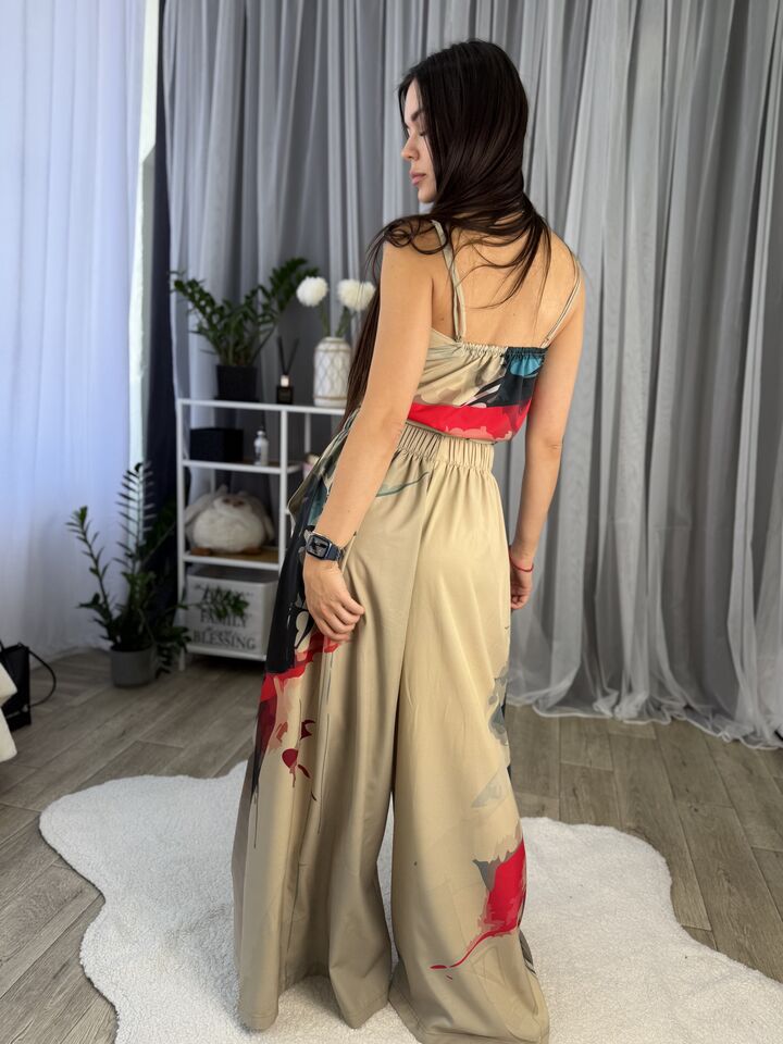 Унікальний жіночий комплект, що складається з брюк та майки на регульованих бретелях. Це не просто одяг — це крутий варіант стильного луку: