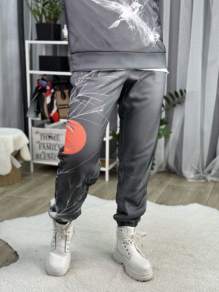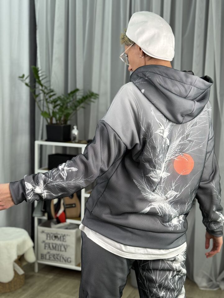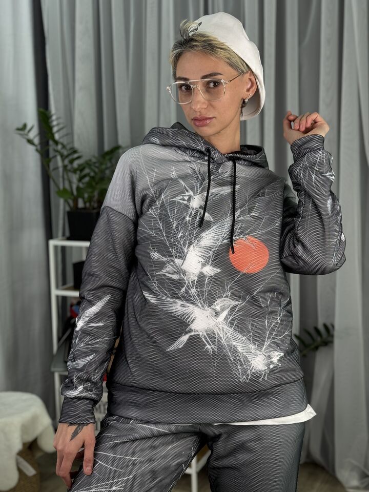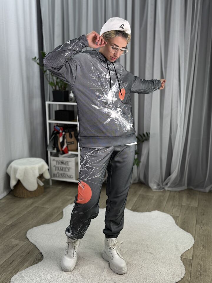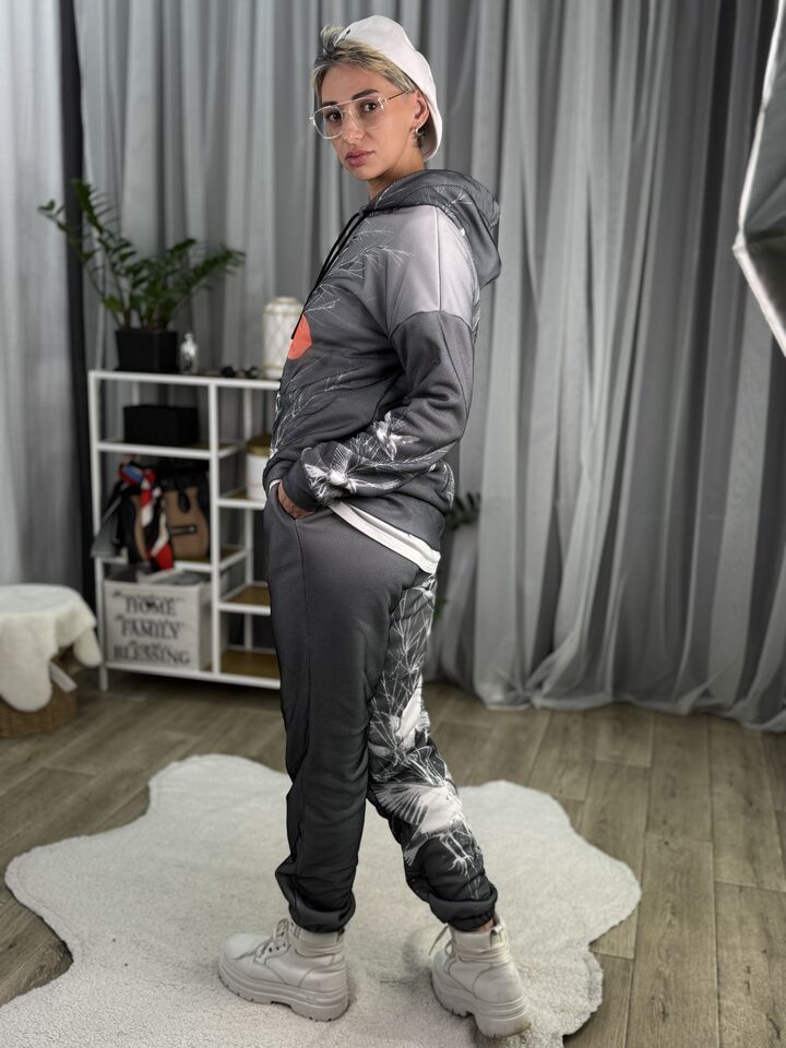 Худі вільного крою із капюшоном, кишені є, плечовий шов спущений, довжина по спинці – 70 см, довжина рукава від горловини — 73 см. Фасон штанів – джогери із еластичною резинкою знизу, є кишені, довжина по зовнішньому шву від поясу 105 см.