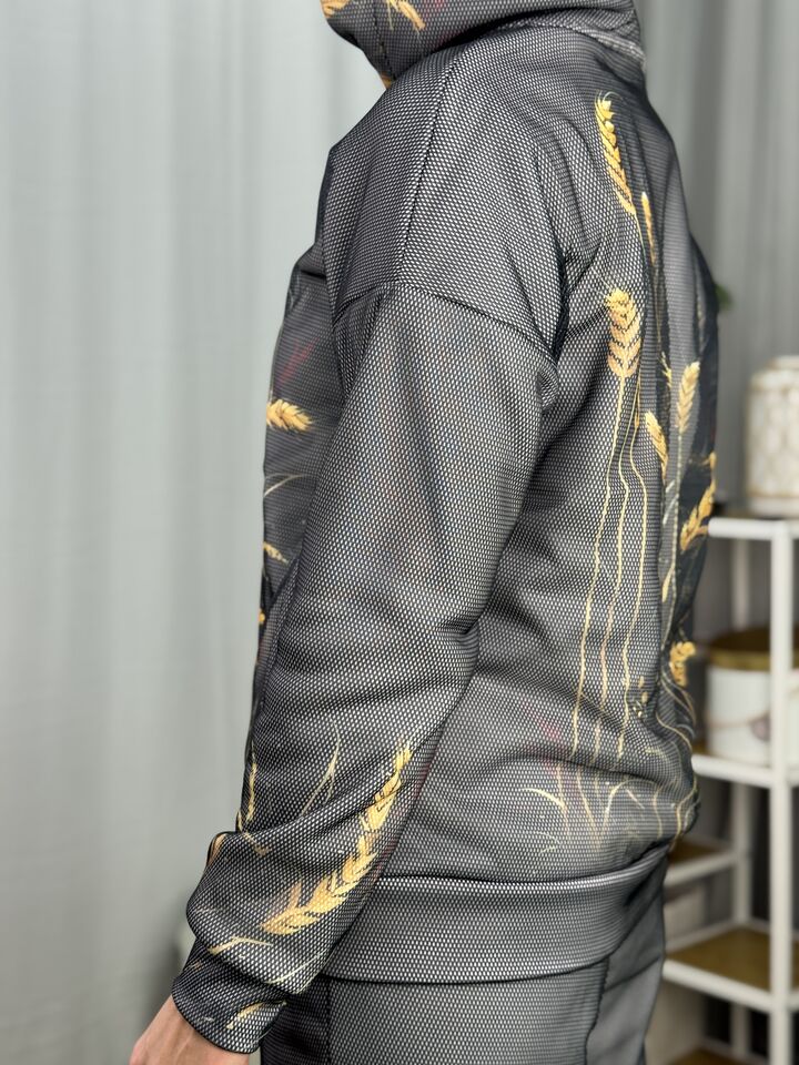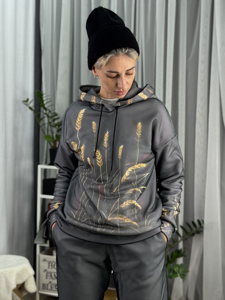 Худі вільного крою із капюшоном, кишені є, плечовий шов спущений, довжина по спинці – 70 см, довжина рукава від горловини — 73 см. Фасон штанів – джогери із еластичною резинкою знизу, є кишені, довжина по зовнішньому шву від поясу 105 см.