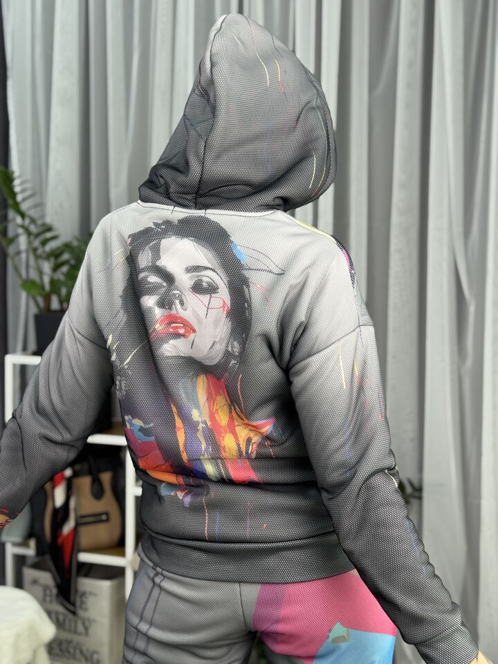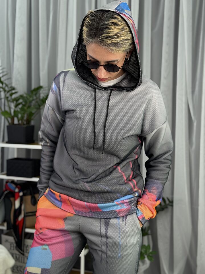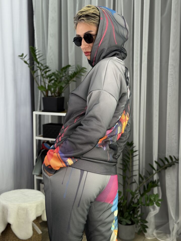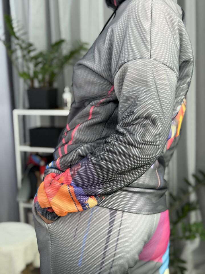 Худі вільного крою із капюшоном, кишені є, плечовий шов спущений, довжина по спинці – 70 см, довжина рукава від горловини — 73 см. Фасон штанів – джогери із еластичною резинкою знизу, є кишені, довжина по зовнішньому шву від поясу 105 см.