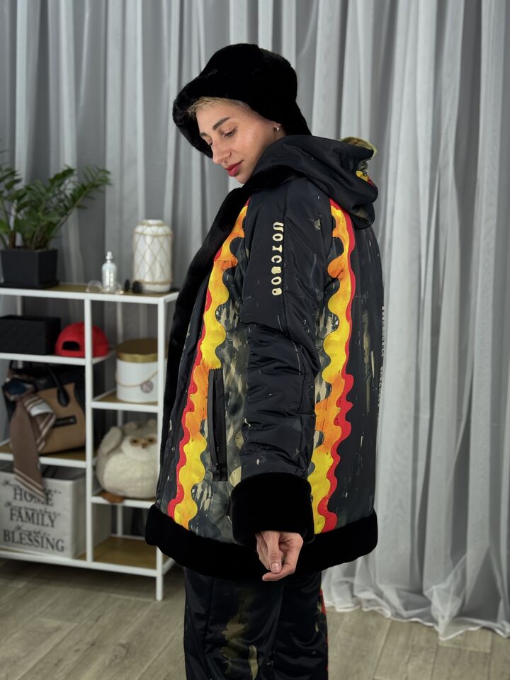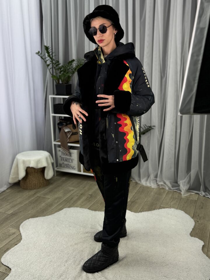 Прямого крою, зручна посадка на будь-який тип фігури, зсередини екохутро кролика, зверху влагостійка плащівка, рукава регланом, широка пройма, застібається на кнопки, декорована ланцюжками на боках та вороті,  довжина виробу: 80 см, довжина рукава від горловини: 80 см, зима, температурний режим: до -20°C.