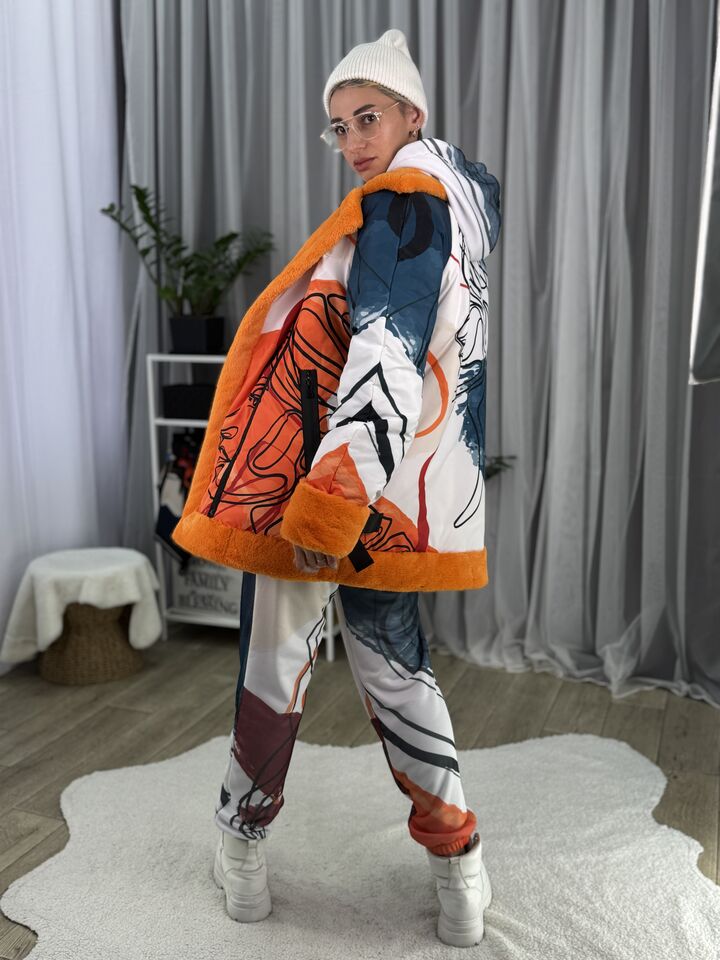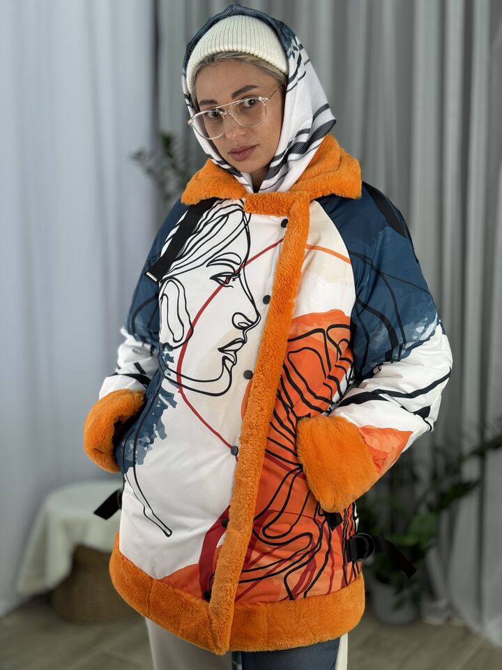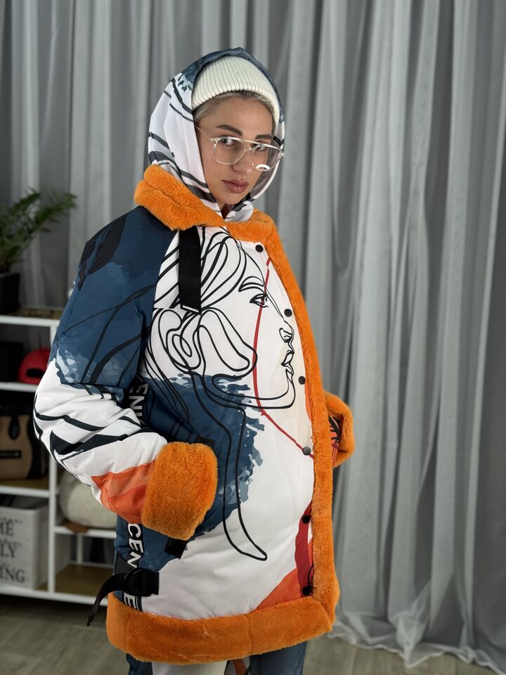 Прямого крою, зручна посадка на будь-який тип фігури, зсередини екохутро кролика, зверху влагостійка плащівка, рукава регланом, широка пройма, застібається на кнопки, декорована ланцюжками на боках та вороті,  довжина виробу: 80 см, довжина рукава від горловини: 80 см, зима, температурний режим: до -20°C.