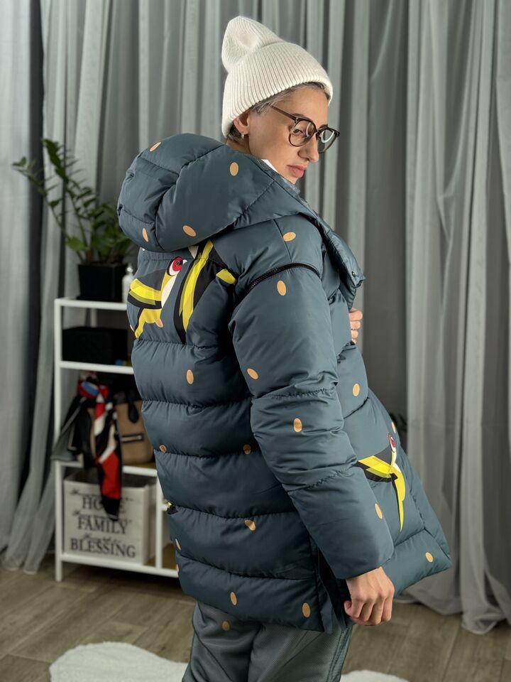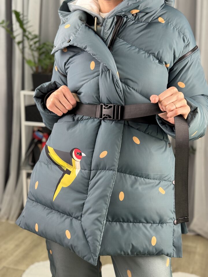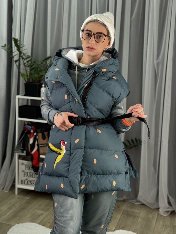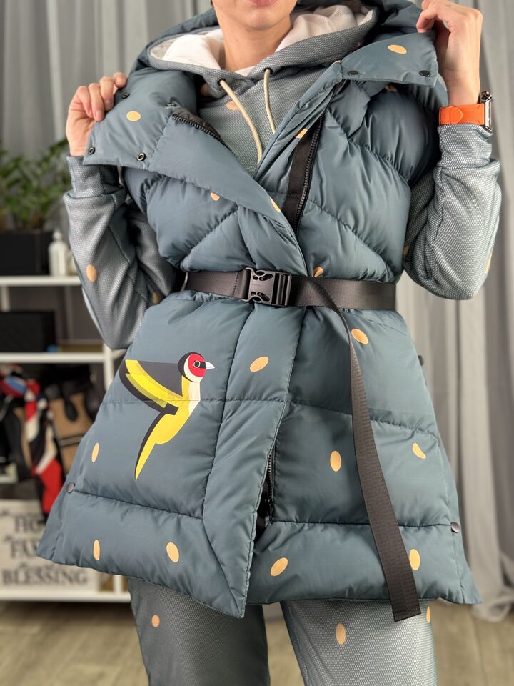 Прямий крій, зручний для руху та багатошарових образів, застібається на блискавку + планка з кнопками, рукави відстібуються на блискавці — легко трансформується в жилет, приховані манжети — для додаткового захисту від вітру, вшитий капюшон — теплий і зручний, розрізи з боків на кнопках — для свободи кроку та стильного вигляду, функціональні кишені з обох боків, пояс у комплекті — для підкреслення талії, довжина виробу: 80 см, довжина рукава від горловини: 77 см, температурний режим: до -20°C